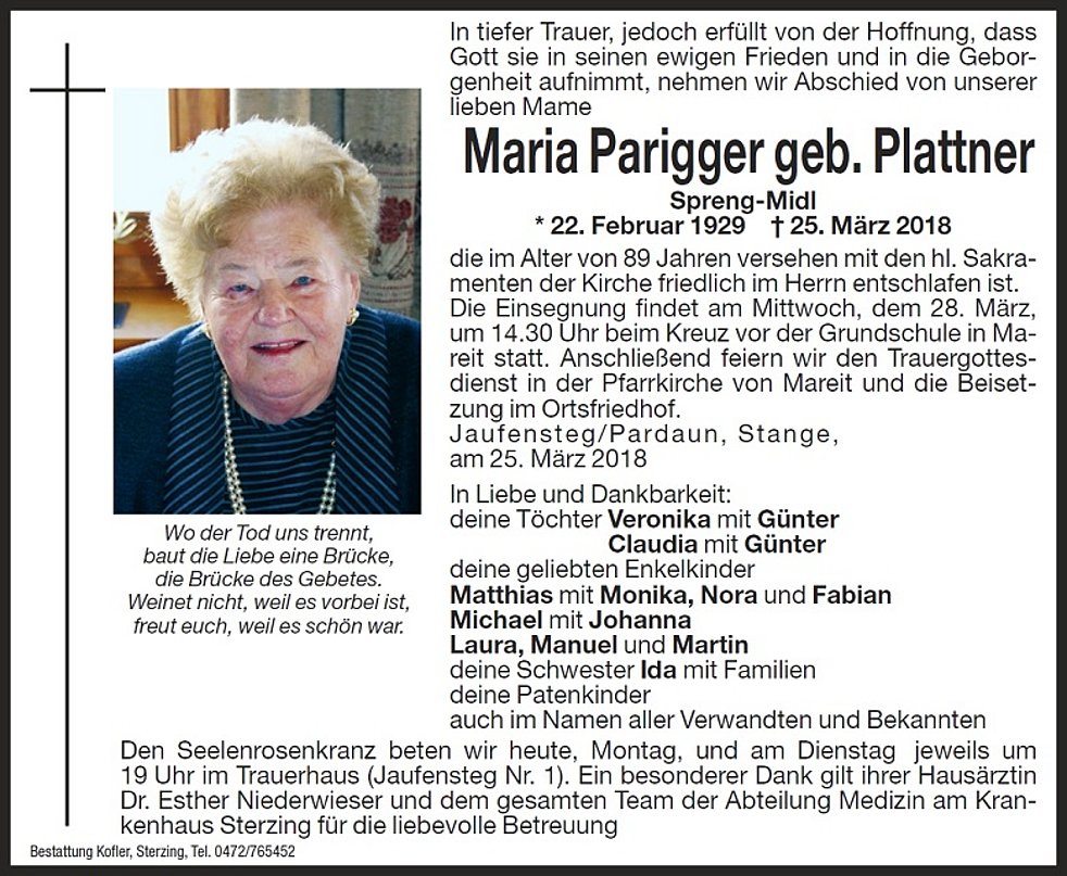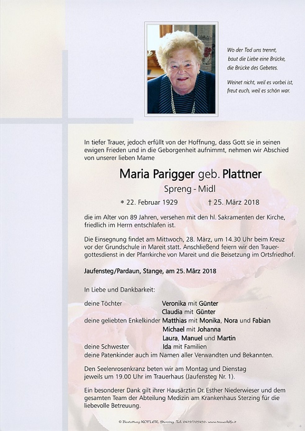 Die Einsegnung findet am Mittwoch, 28. März, um 14.30 Uhr beim Kreuz vor der Grundschule in Mareit statt. Anschließend feiern wir den Trauergottesdienst in der Pfarrkirche von Mareit und die Beisetzung im Ortsfriedhof.