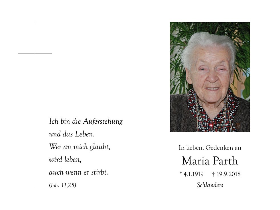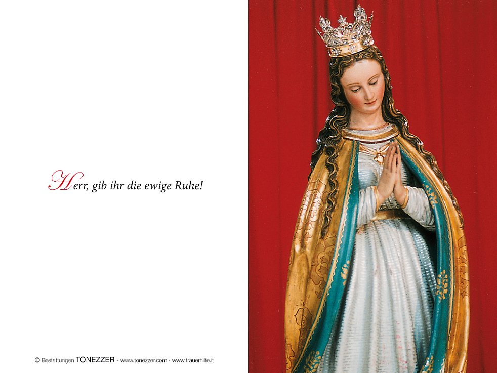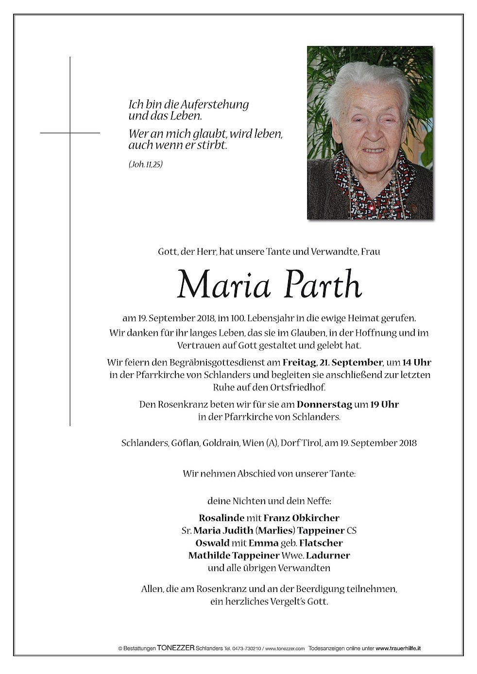 Wir feiern den Begräbnisgottesdienst am Freitag, 21. September, um 14 Uhr in der Pfarrkirche von Schlanders und begleiten sie anschließend zur letzten Ruhe auf den Ortsfriedhof.