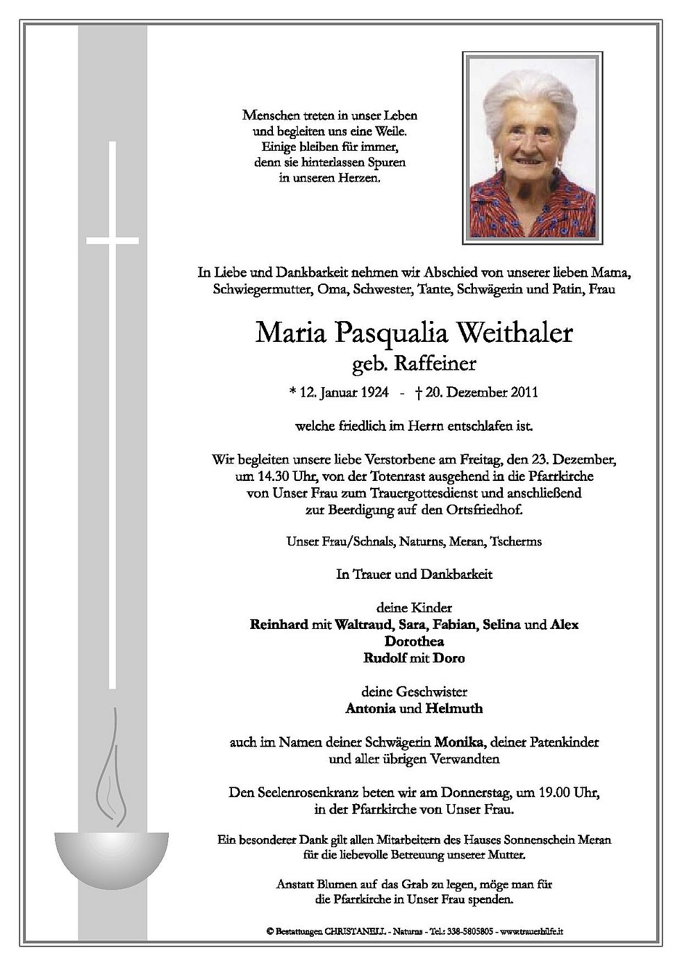 Wir begleiten unsere liebe Verstorbene am Freitag, den 23. Dezember, um 14.30 Uhr, von der Totenrast ausgehend in die Pfarrkirche von Unser Frau zum Trauergottesdienst und anschließend zur Beerdigung auf den Ortsfriedhof.