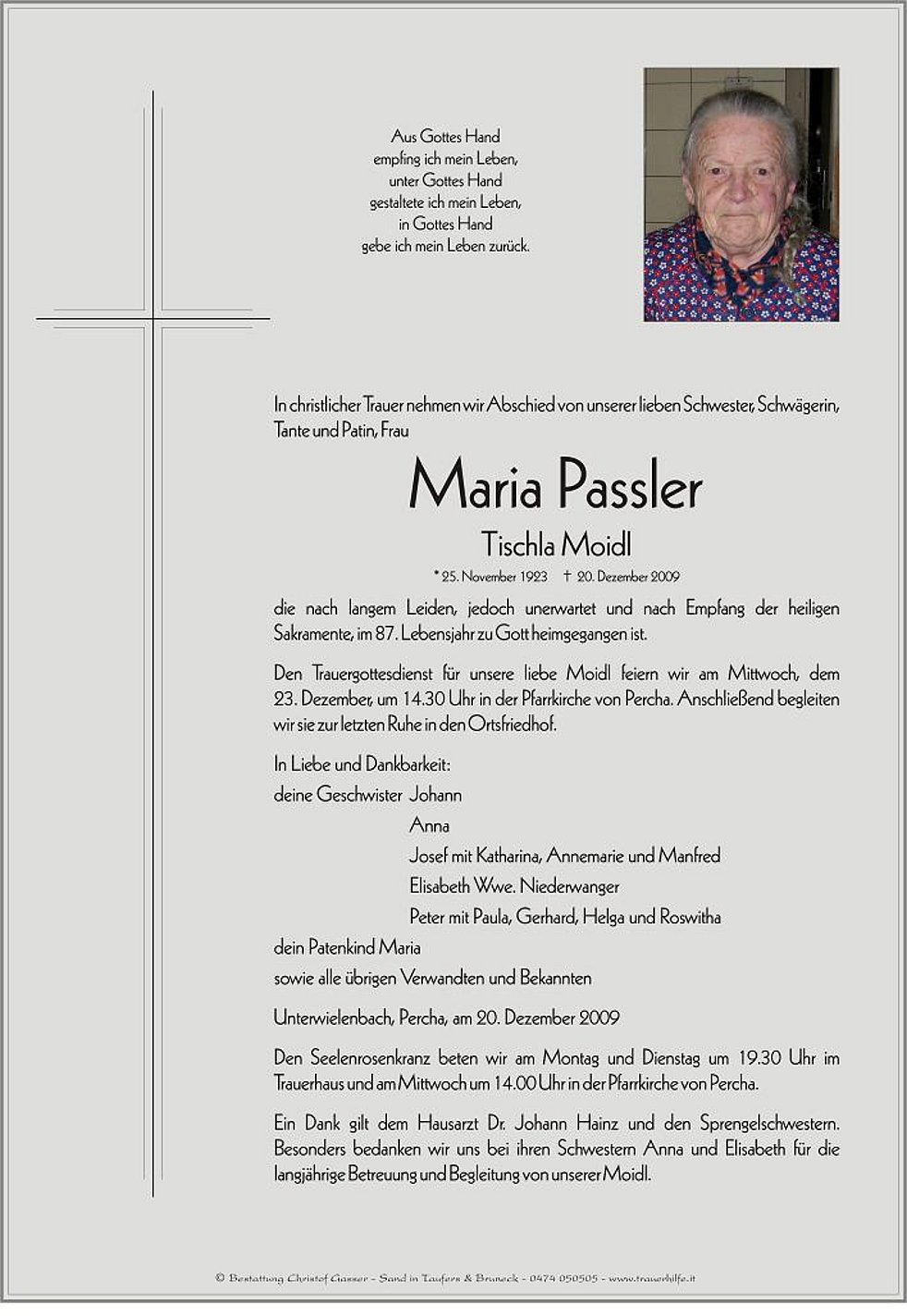 23. Dezember, um 14.30 Uhr in der Pfarrkirche von Percha. Anschließend begleiten wir sie zur letzten Ruhe in den Ortsfriedhof.
