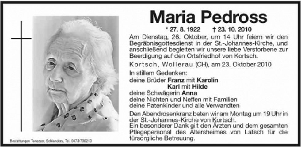 Am Dienstag, 26. Oktober, um 14 Uhr feiern wir den Begräbnisgottesdienst in der St. Johannes-Kirche und anschließend begleiten wir unsere liebe Verstorbene zur Beerdigung auf den Ortsfriedhof von Kortsch.