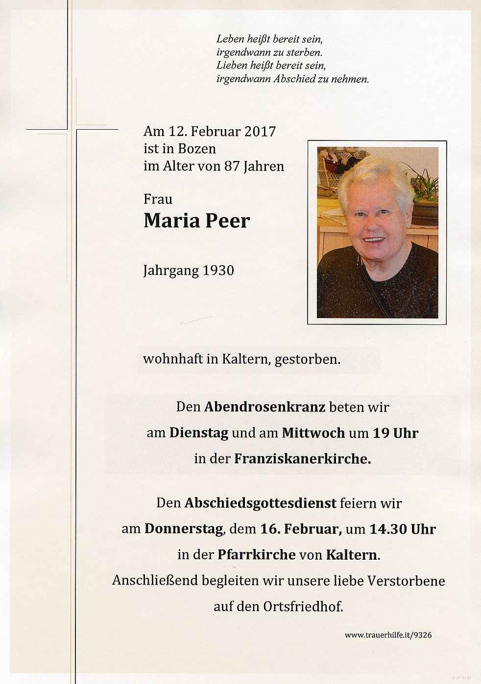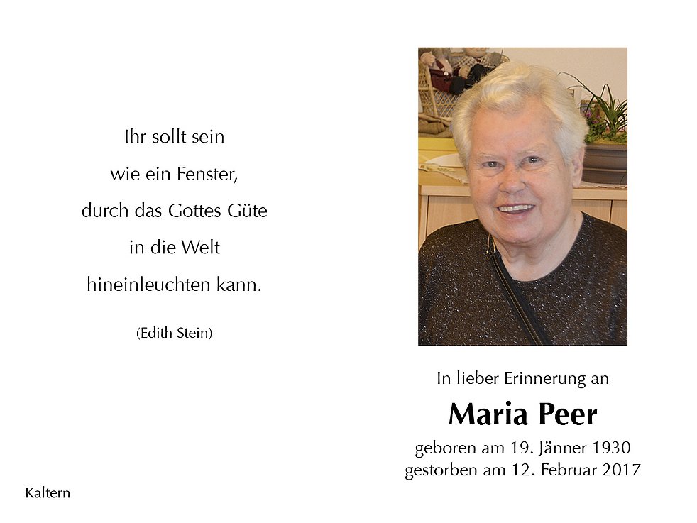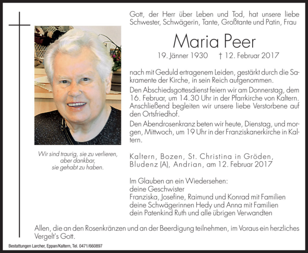 Den Abschiedsgottesdienst feiern wir am Donnerstag, den 16. Februar um 14.30 Uhr in der Pfarrkirche von Kaltern. Anschließend begleiten wir unsere liebe Verstorbene auf den Ortsfriedhof.