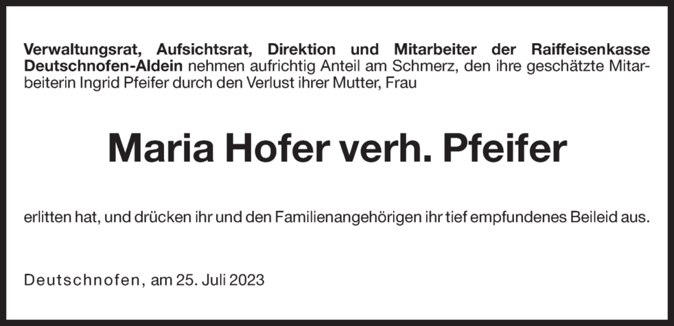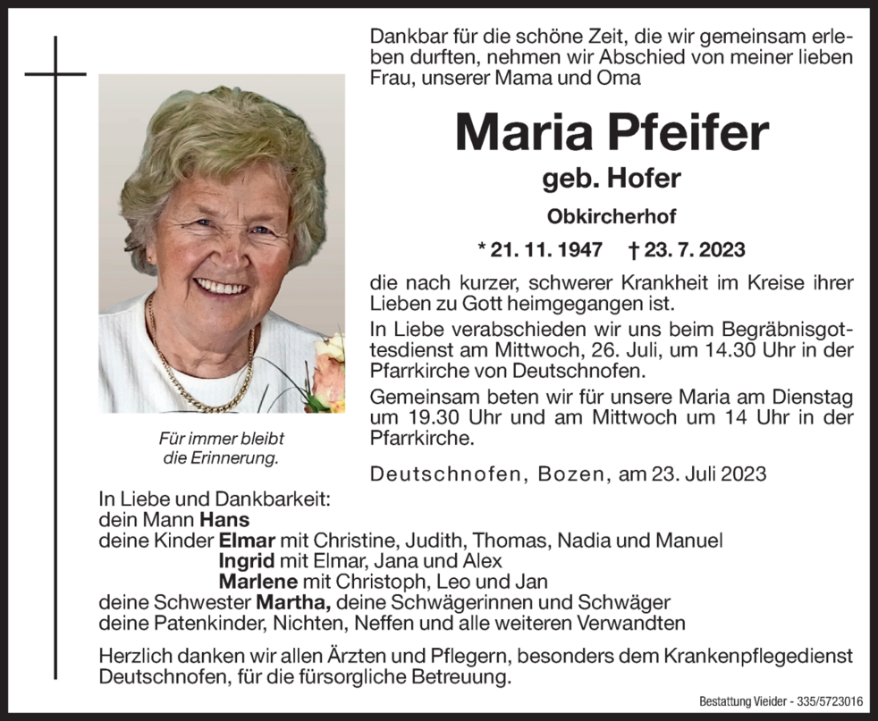 In Liebe verabschieden wir uns beim Begräbnisgottesdienst am Mittwoch, 26. Juli, um 14.30 Uhr in der Pfarrkirche von Deutschnofen.