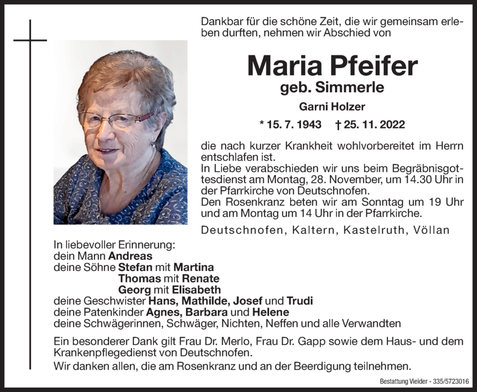 In Liebe verabschieden wir uns beim Begräbnisgottesdienst am Montag, 28. November, um 14.30 Uhr in der Pfarrkirche von Deutschnofen.