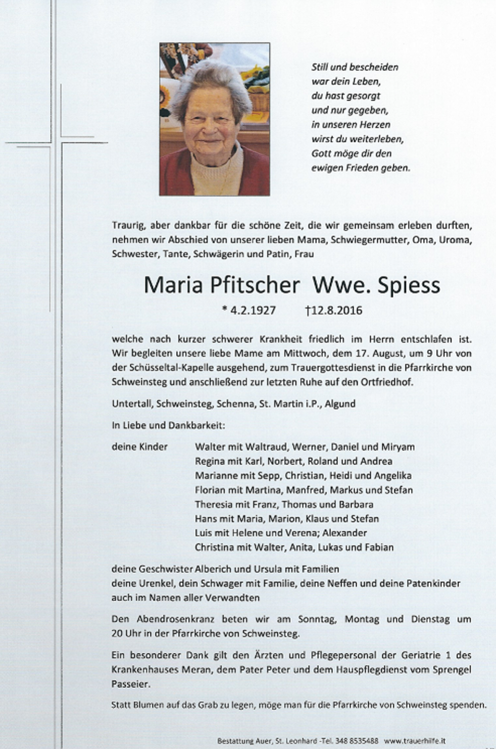 Statt Blumen auf das Grab zu legen, möge man für die Pfarrkirche von Schweinsteg spenden.