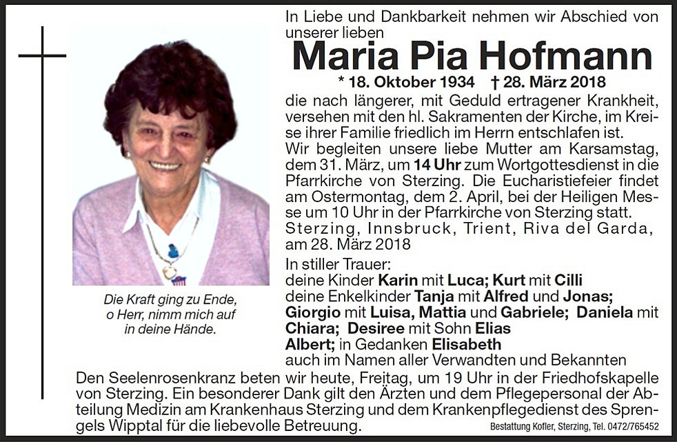 Wir begleiten unsere liebe Mutter am Karsamstag, dem 31. März um 14.00 Uhr zum Wortgottesdienst in die Pfarrkirche von Sterzing und anschließend zur letzten Ruhe auf den Ortsfriedhof.