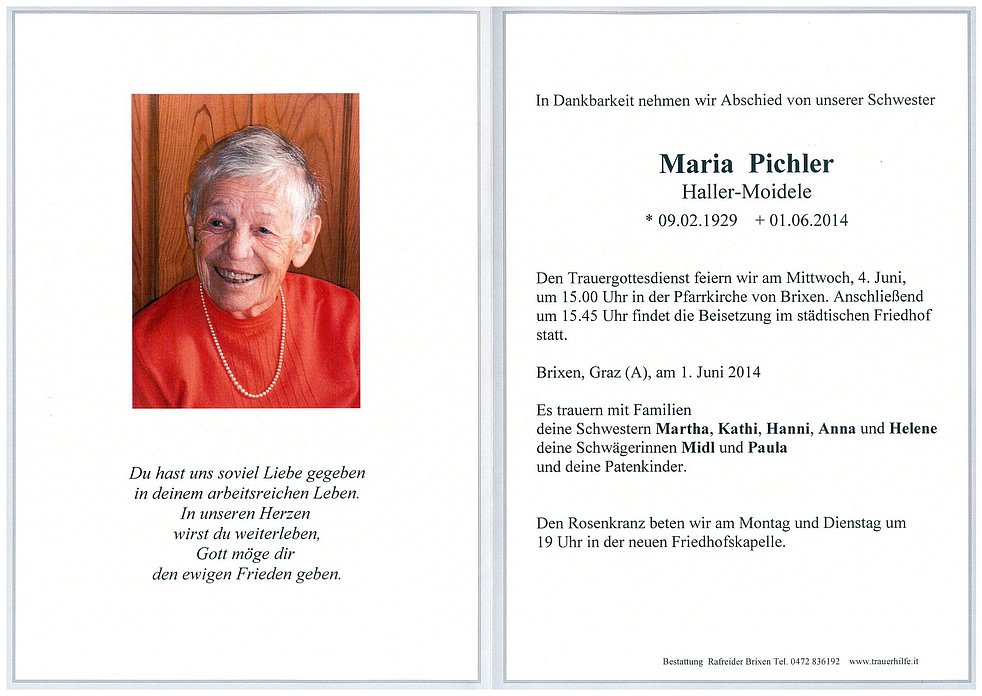 Den Trauergottesdienst feiern wir am Mittwoch, 4. Juni, um 15.00 Uhr in der Pfarrkirche von Brixen. Anschließend um 15.45 Uhr findet die Beisetzung im städtischen Friedhof statt.
