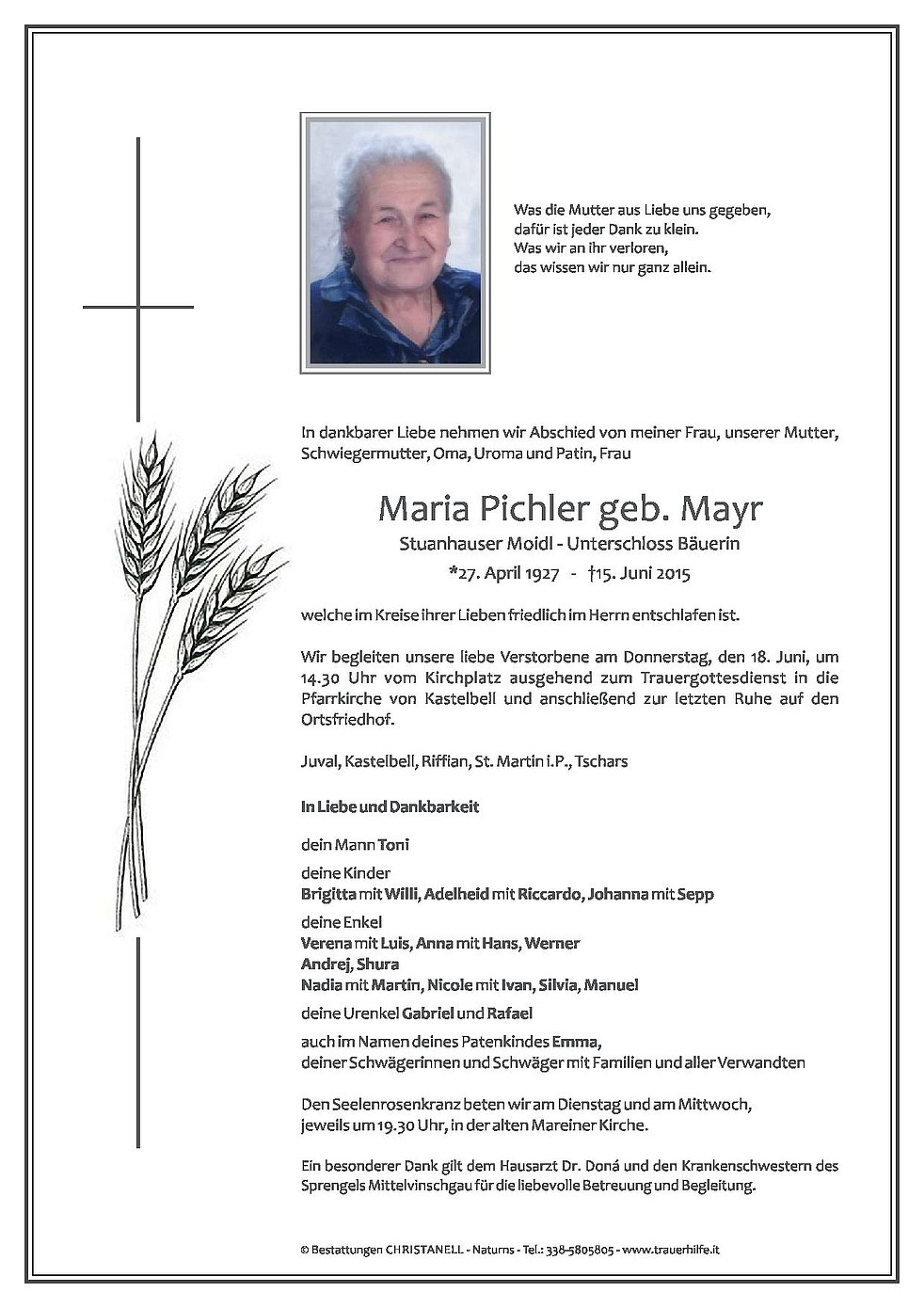 Wir begleiten unsere liebe Verstorbene am Donnerstag, den 18. Juni, um 14.30 Uhr vom Kirchplatz ausgehend zum Trauergottesdienst in die Pfarrkirche von Kastelbell und anschließend zur letzten Ruhe auf den Ortsfriedhof.