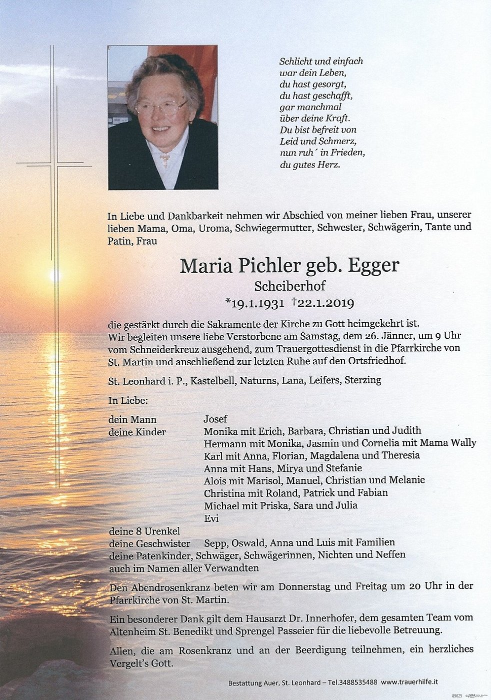 Wir begleiten unsere liebe Verstorbene am Samstag, dem 26. Jänner, um 9 Uhr vom Schneiderkreuz ausgehend, zum Trauergottesdienst in die Pfarrkirche von St. Martin und anschließend zur letzten Ruhe auf den Ortsfriedhof.