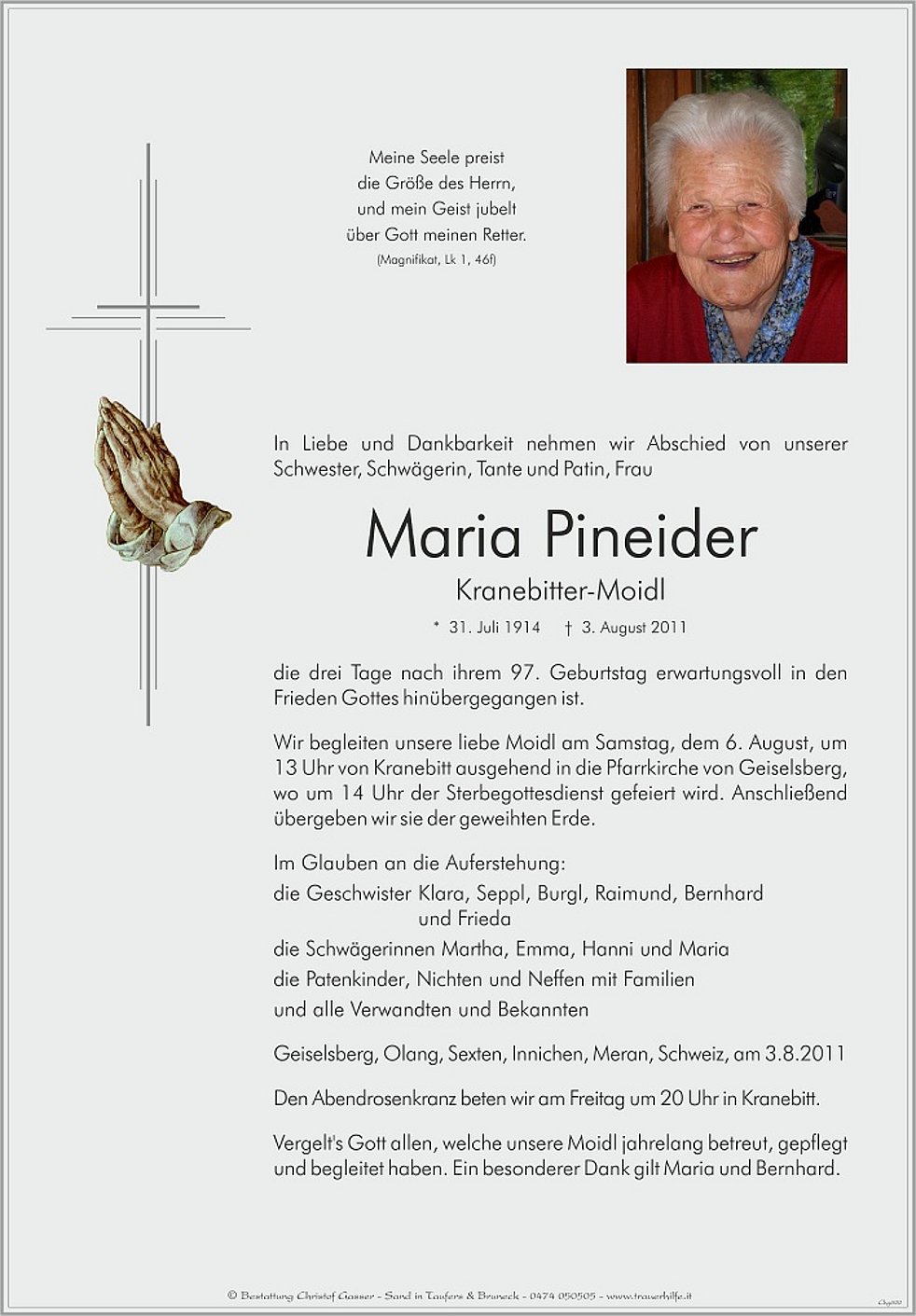 Wir begleiten unsere liebe Moidl am Samstag, dem 6. August, um 13 Uhr von Kranebitt ausgehend in die Pfarrkirche von Geiselsberg, wo um 14 Uhr der Sterbegottesdienst gefeiert wird. Anschließend übergeben wir sie der geweihten Erde.