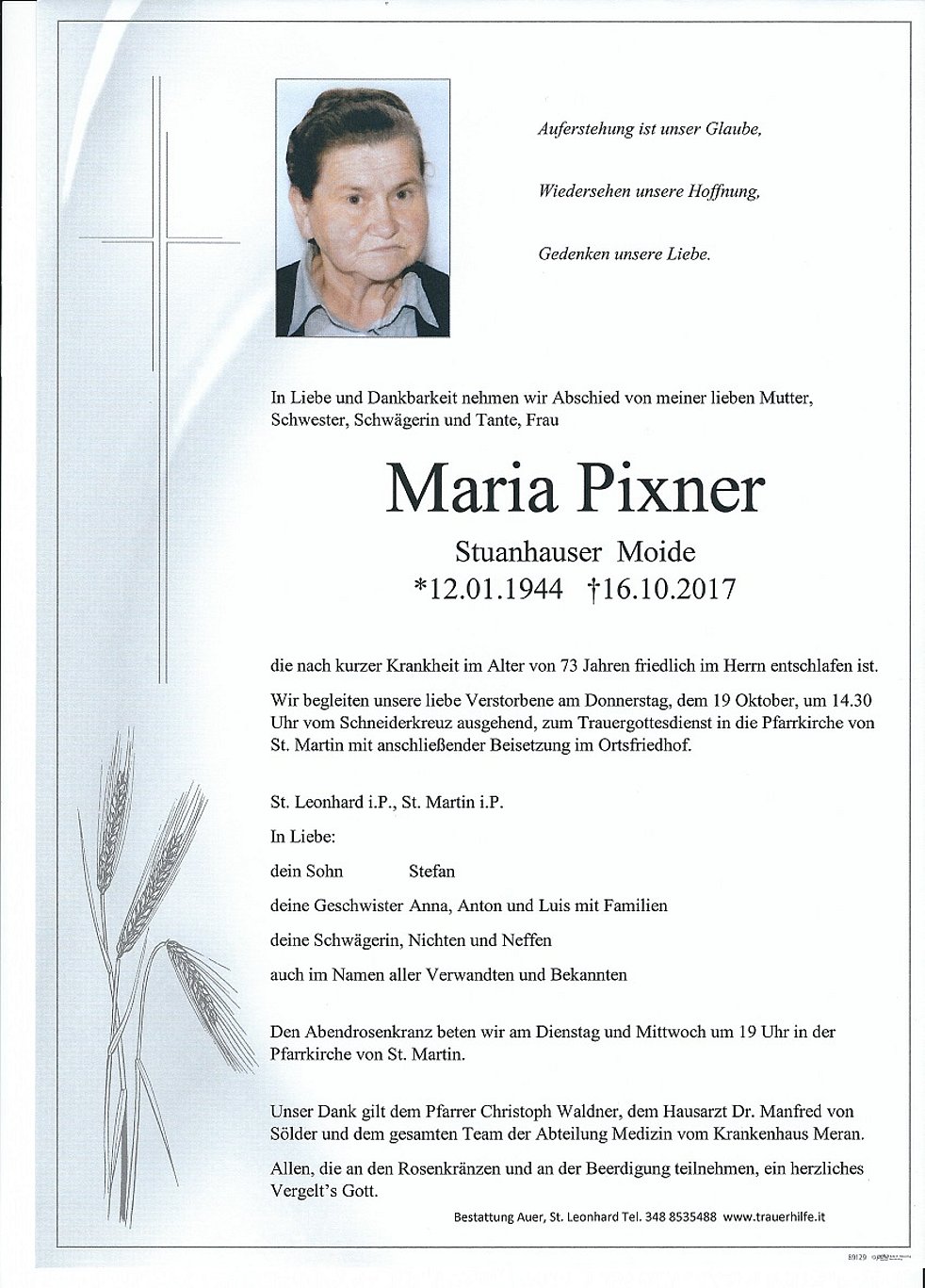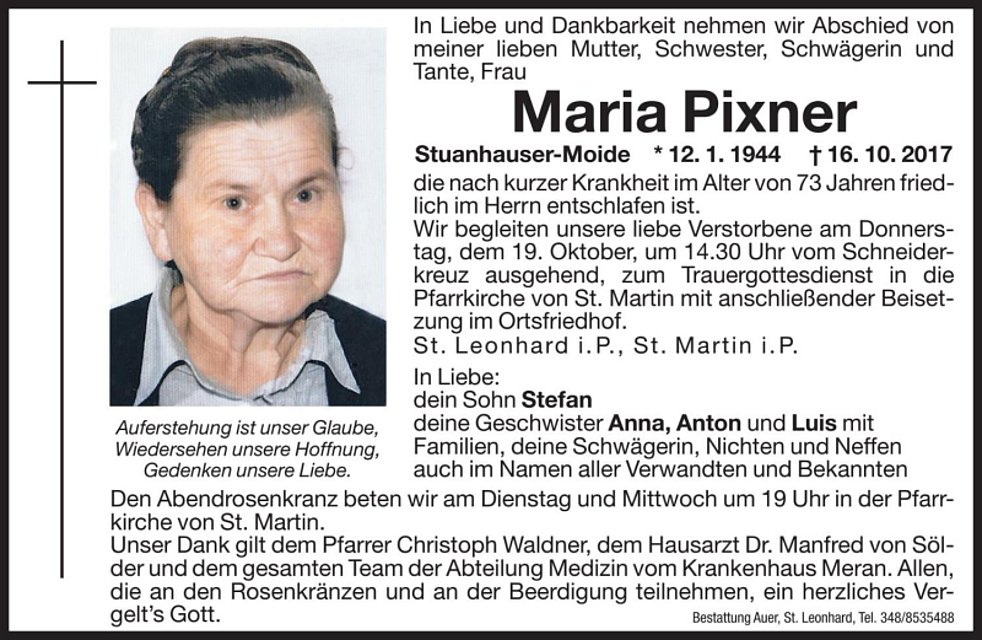 Wir begleiten unsere liebe Verstorbene am Donnerstag, dem 19 Oktober, um 14.30 Uhr vom Schneiderkreuz ausgehend, zum Trauergottesdienst in die Pfarrkirche von St. Martin mit anschließender Beisetzung im Ortsfriedhof.