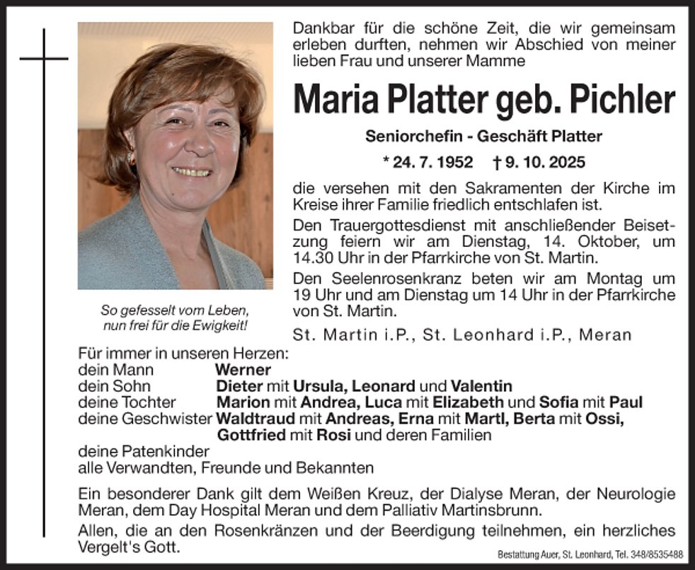 Den Trauergottesdienst mit anschließender Beisetzung feiern wir am Dienstag, 14. Oktober, um 14.30 Uhr in der Pfarrkirche von St. Martin.
