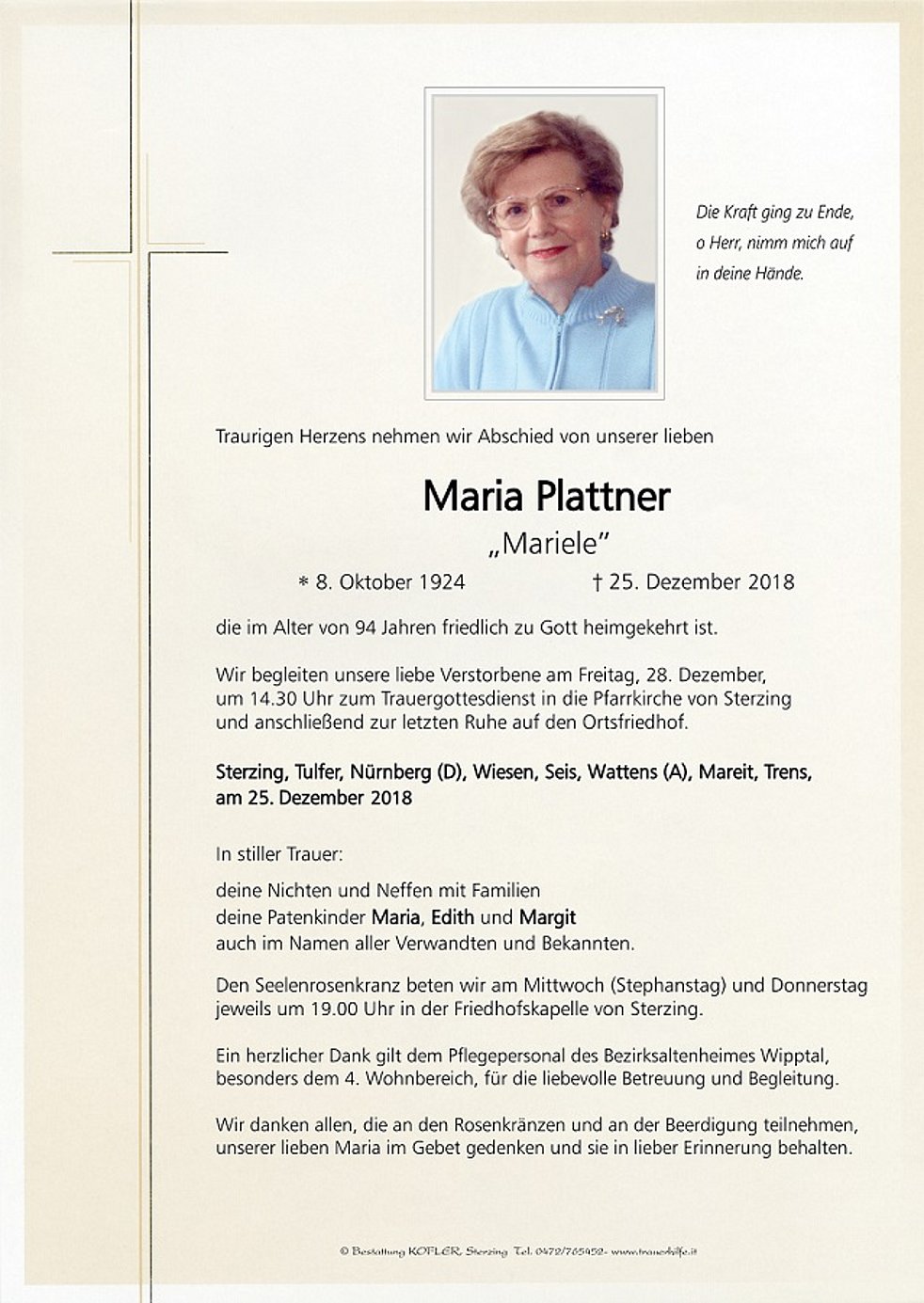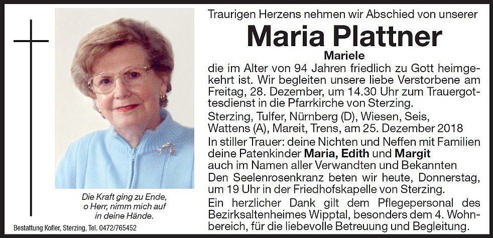 Wir begleiten unsere liebe Verstorbene am Freitag, 28. Dezember, um 14.30 Uhr zum Trauergottesdienst in die Pfarrkirche von Sterzing und anschließend zur letzten Ruhe auf den Ortsfriedhof.