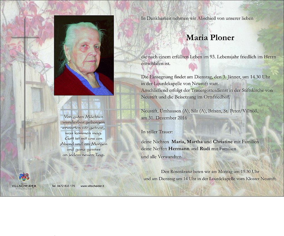 Die Einsegnung findet am Dienstag, den 3. Jänner, um 14.30 Uhr