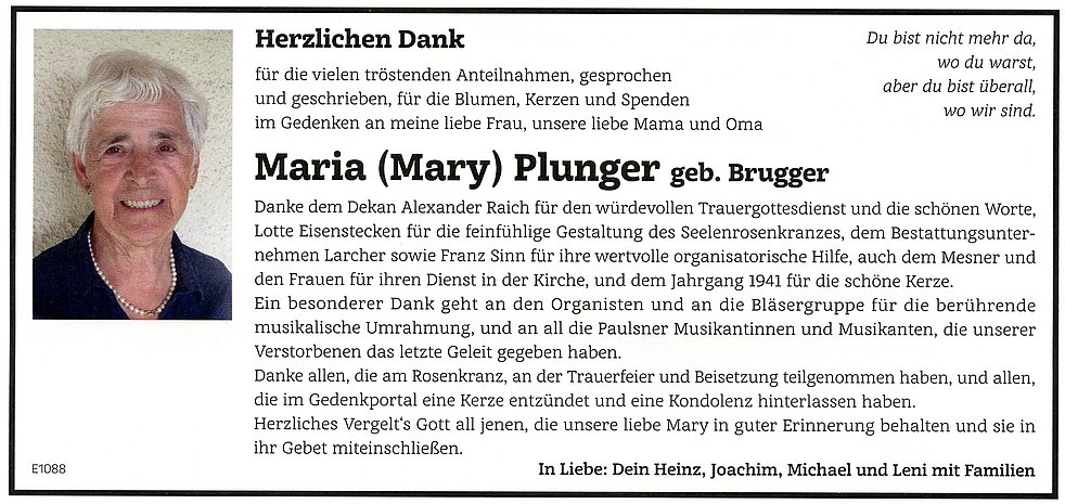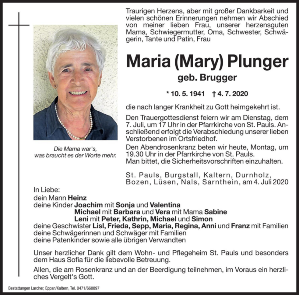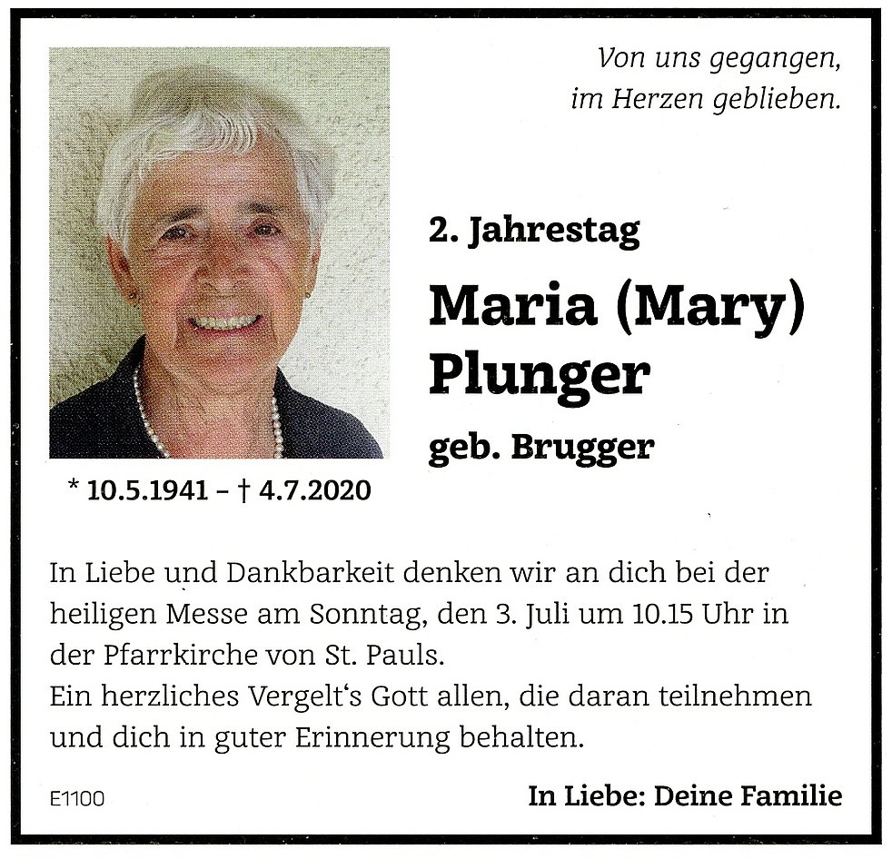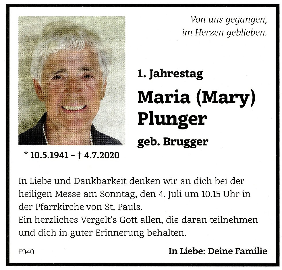 Den Trauergottesdienst feiern wir am Dienstag, dem 7. Juli um 17 Uhr in der Pfarrkirche von St. Pauls. Anschließend erfolgt die Verabschiedung unserer lieben Verstorbenen im Ortsfriedhof.
