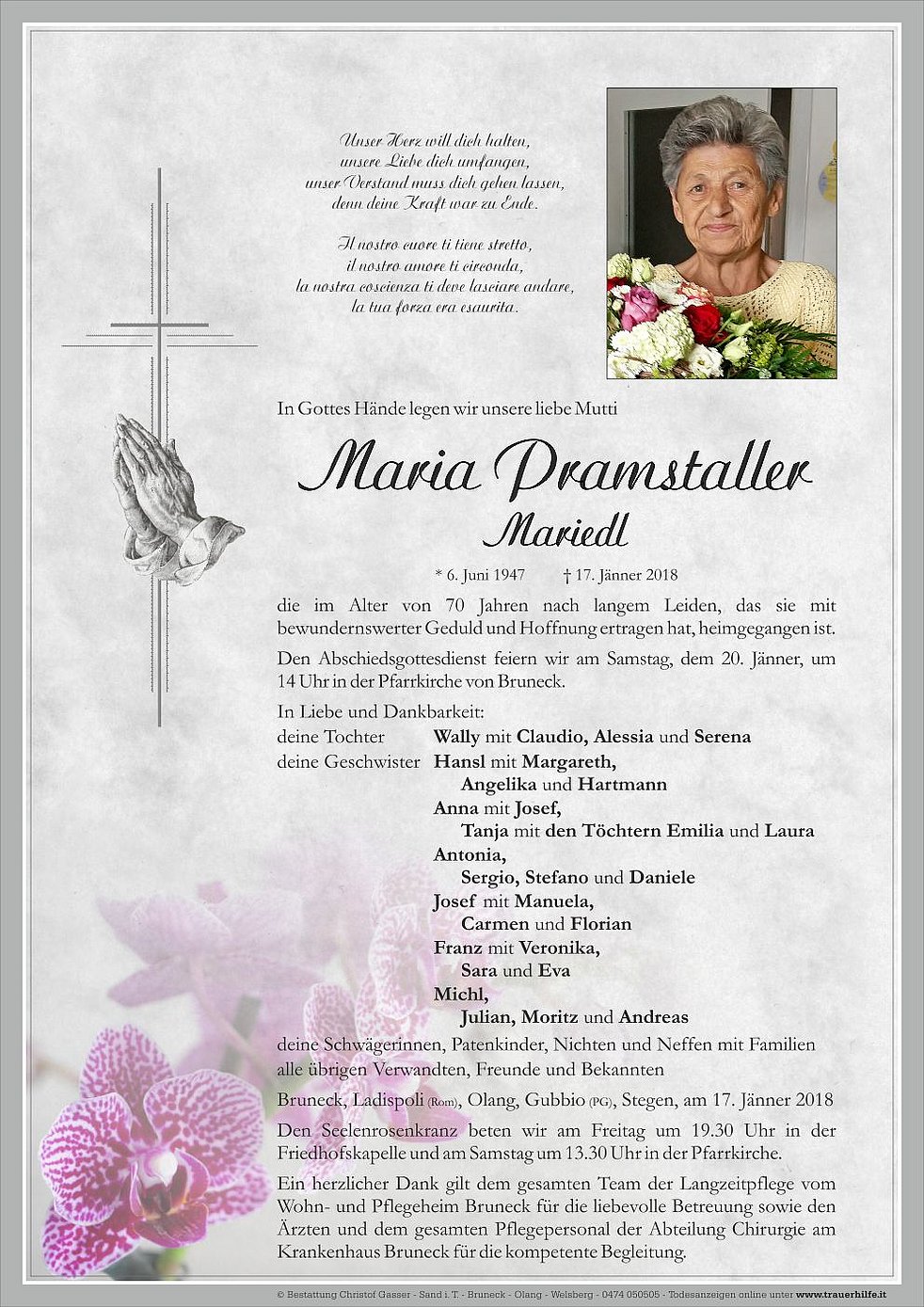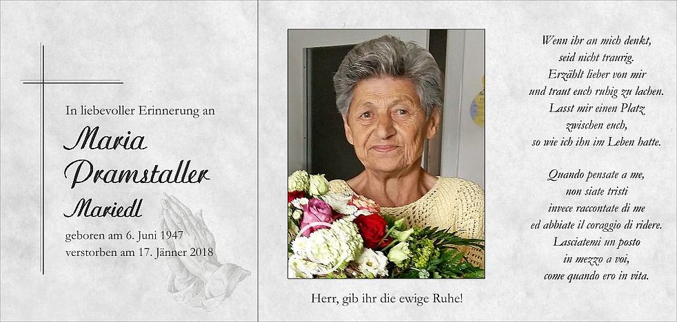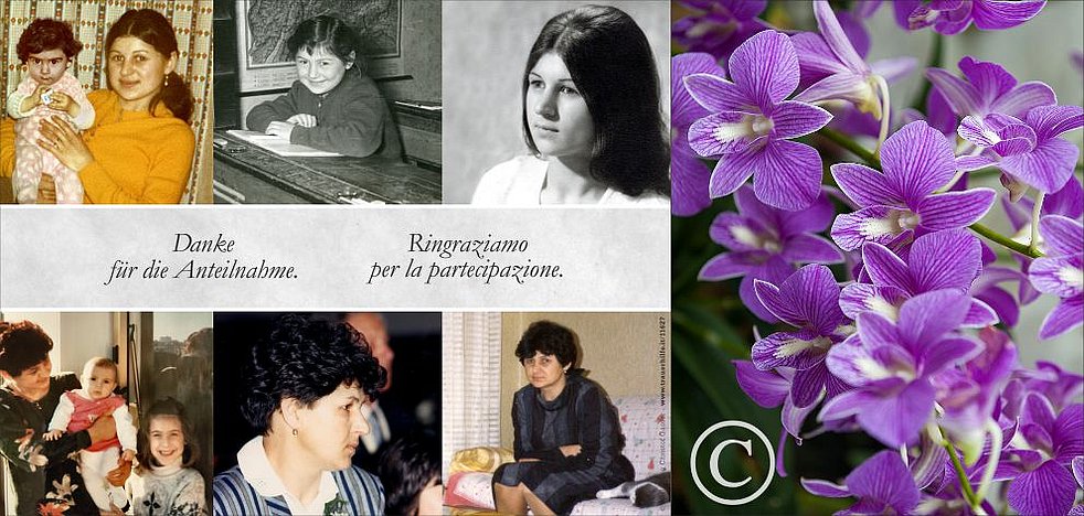 Ein herzlicher Dank gilt dem gesamten Team der Langzeitpflege vom Wohn- und Pflegeheim Bruneck für die liebevolle Betreuung sowie den Ärzten und dem gesamten Pflegepersonal der Abteilung Chirurgie am Krankenhaus Bruneck für die kompetente Begleitung.