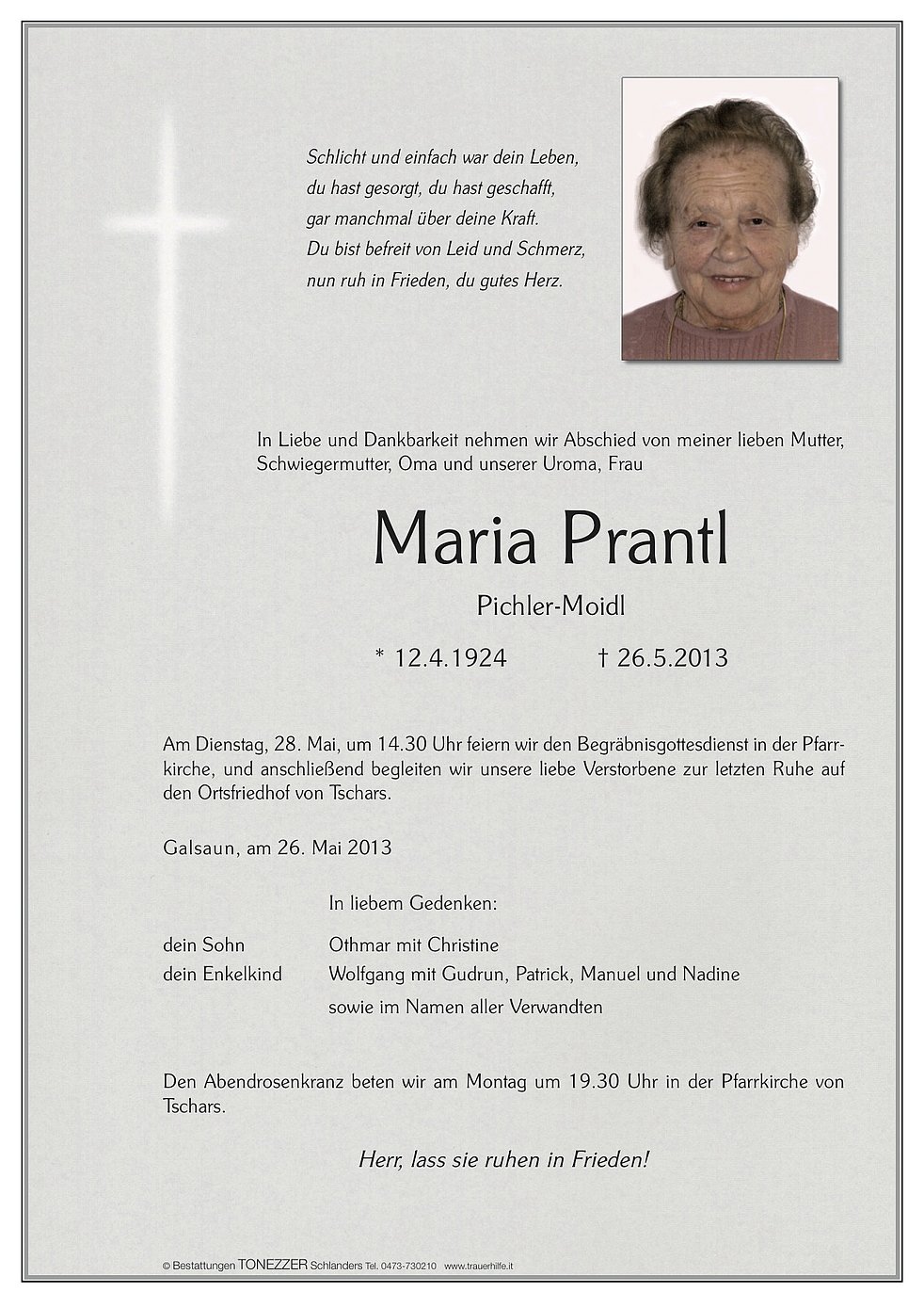Am Dienstag, 28. Mai, um 14.30 Uhr feiern wir den Begräbnisgottesdienst in der Pfarrkirche, und anschließend begleiten wir unsere liebe Verstorbene zur letzten Ruhe auf den Ortsfriedhof von Tschars.