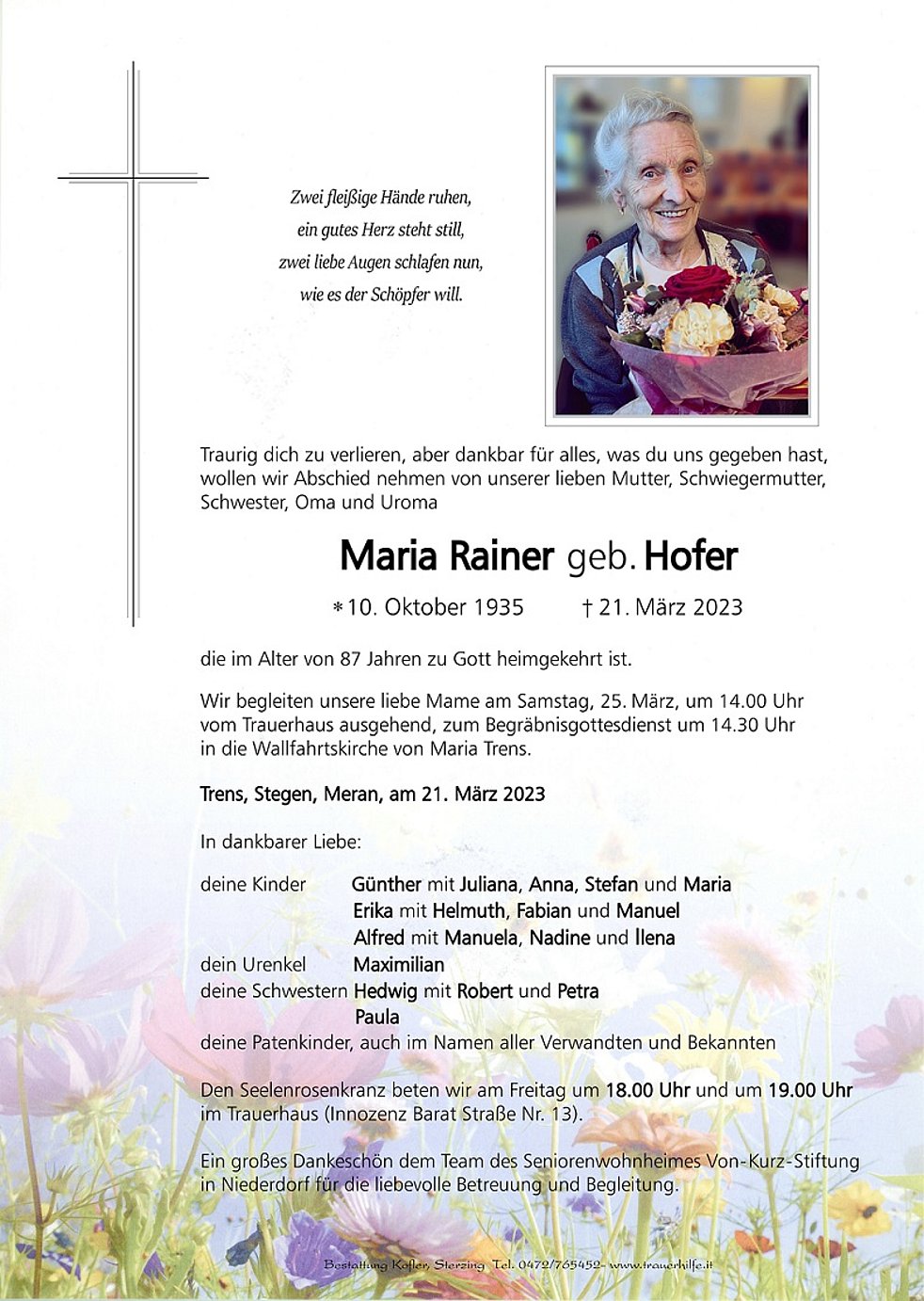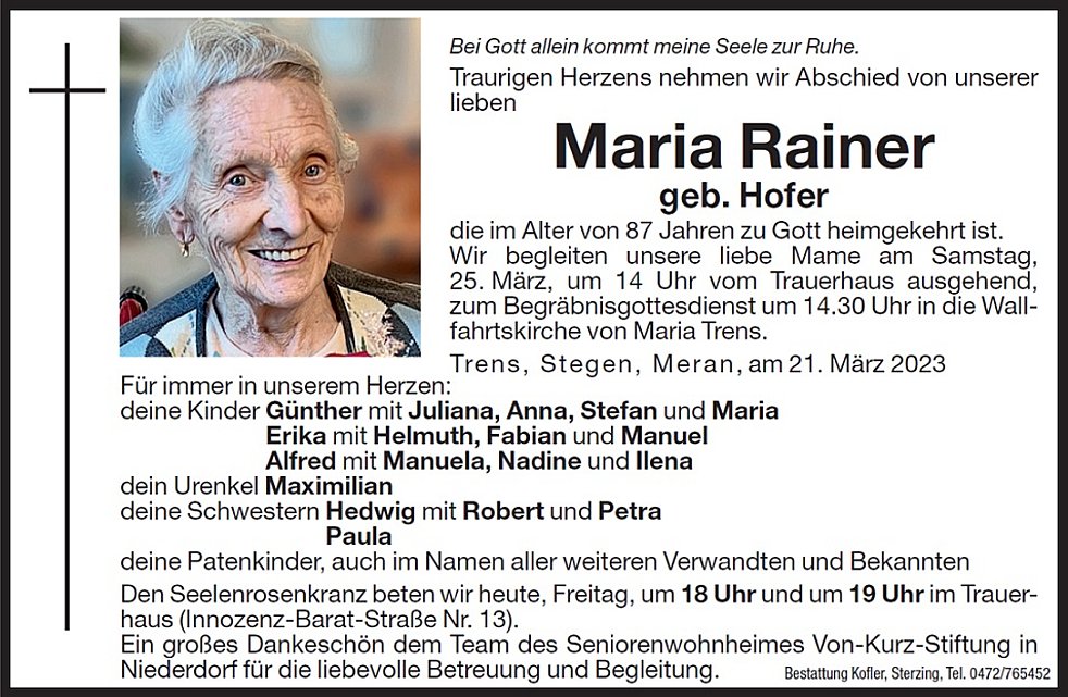 Wir begleiten unsere liebe Mame am Samstag, 25. März, um 14.00 Uhr vom Trauerhaus ausgehend, zum Begräbnisgottesdienst um 14.30 Uhr in die Wallfahrtskirche von Maria Trens.