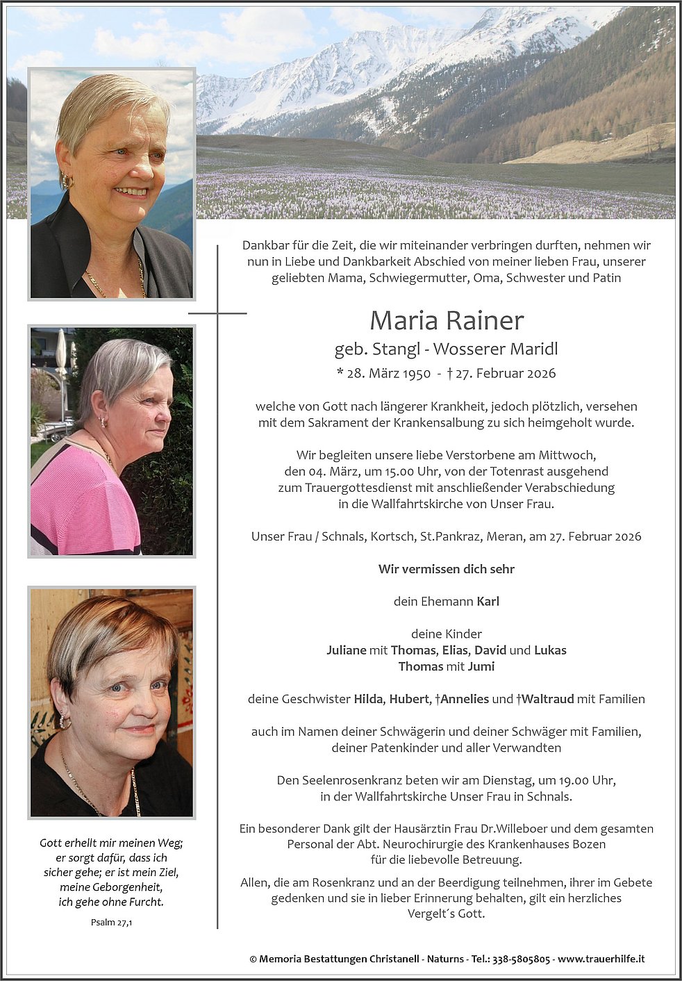 Wir begleiten unsere liebe Verstorbene am Mittwoch, den 04. März, um 15.00 Uhr, von der Totenrast ausgehend zum Trauergottesdienst mit anschließender Verabschiedung