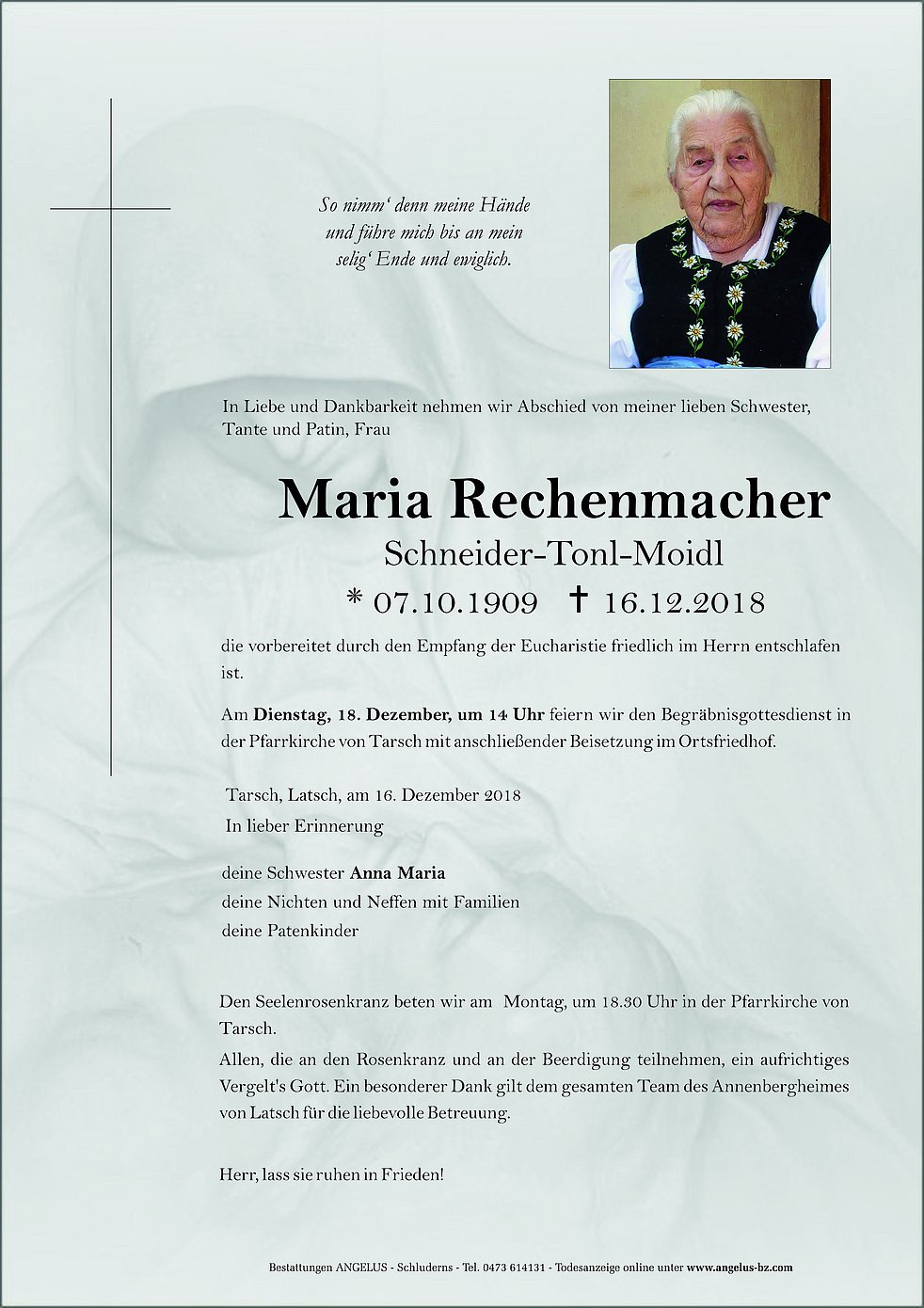 Allen, die an den Rosenkranz und an der Beerdigung teilnehmen, ein aufrichtiges Vergelt's Gott. Ein besonderer Dank gilt dem gesamten Team des Annenbergheimes von Latsch für die liebevolle Betreuung.