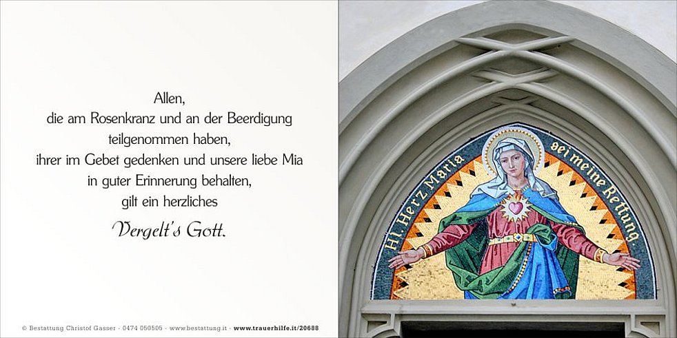 Allen, die am Rosenkranz und der Beerdigung teilnehmen, ihrer im Gebet gedenken und sie in guter Erinnerung behalten, gilt ein herzliches Vergelt’s Gott.
