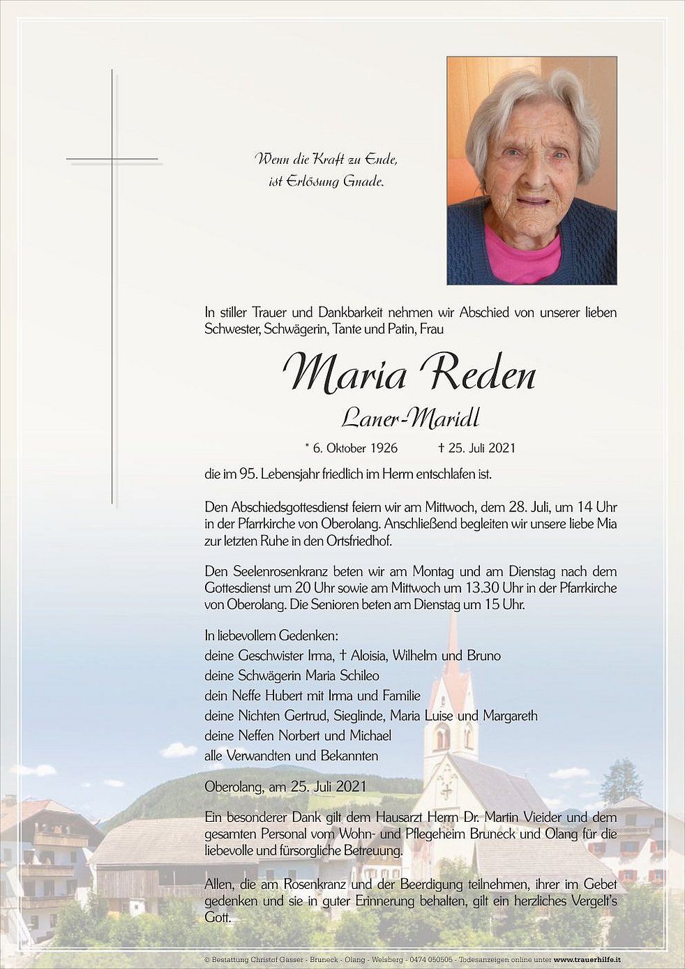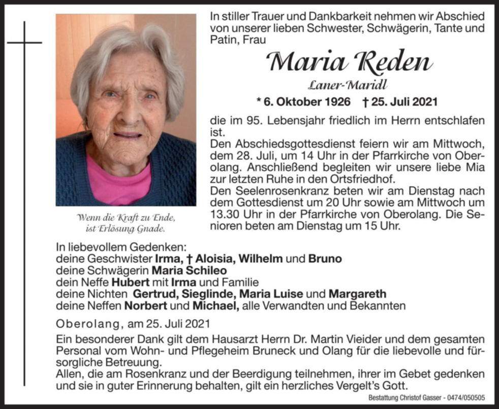 Ein besonderer Dank gilt dem Hausarzt Herrn Dr. Martin Vieider und dem gesamten Personal vom Wohn- und Pflegeheim Bruneck und Olang für die liebevolle und fürsorgliche Betreuung.
