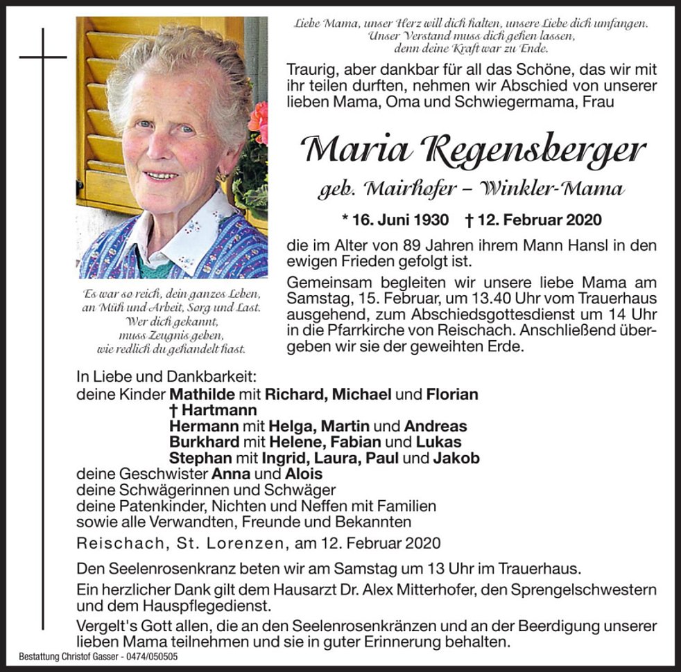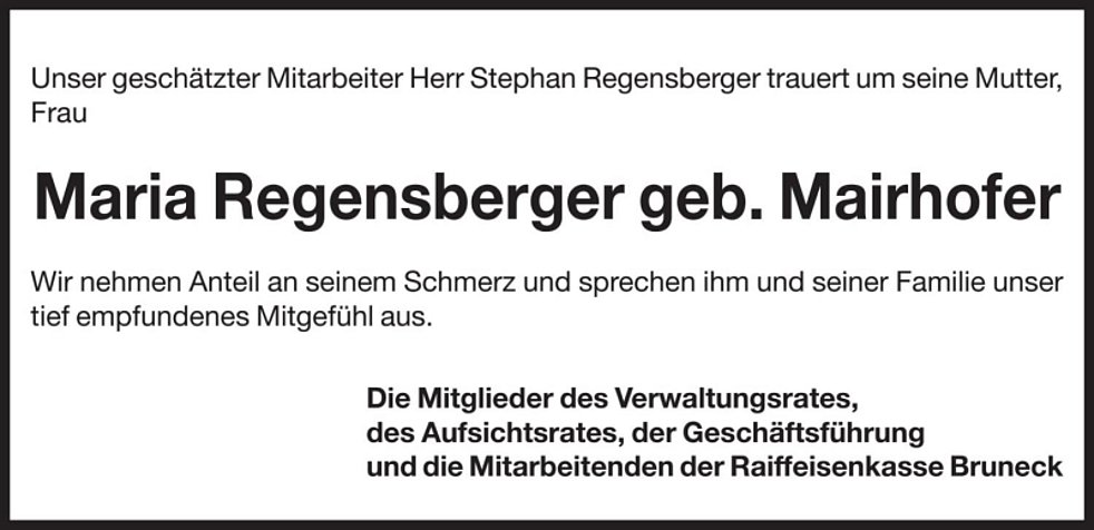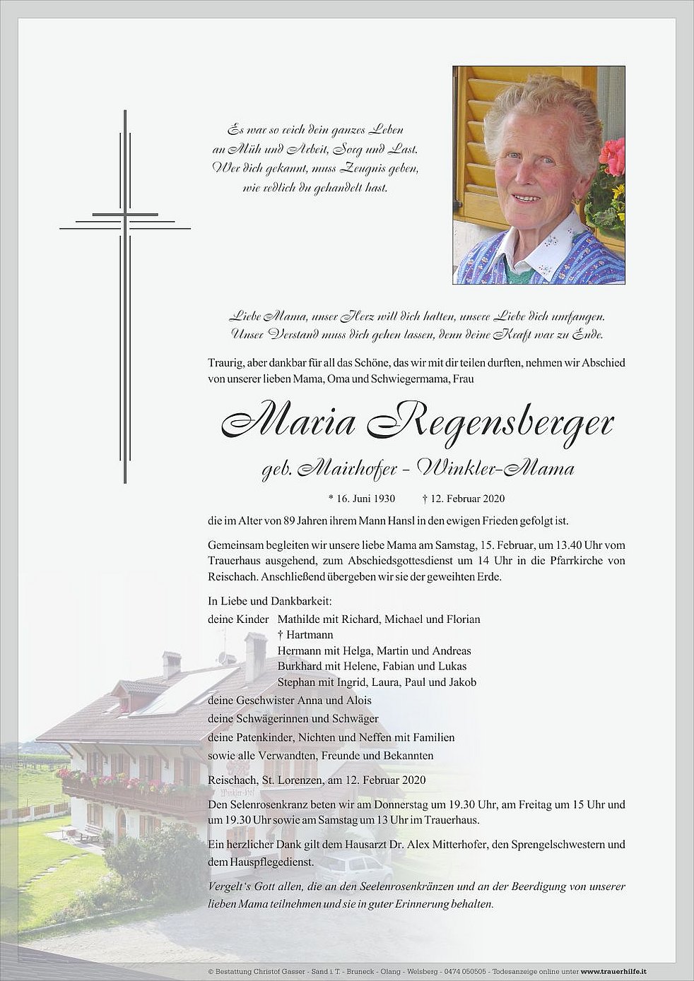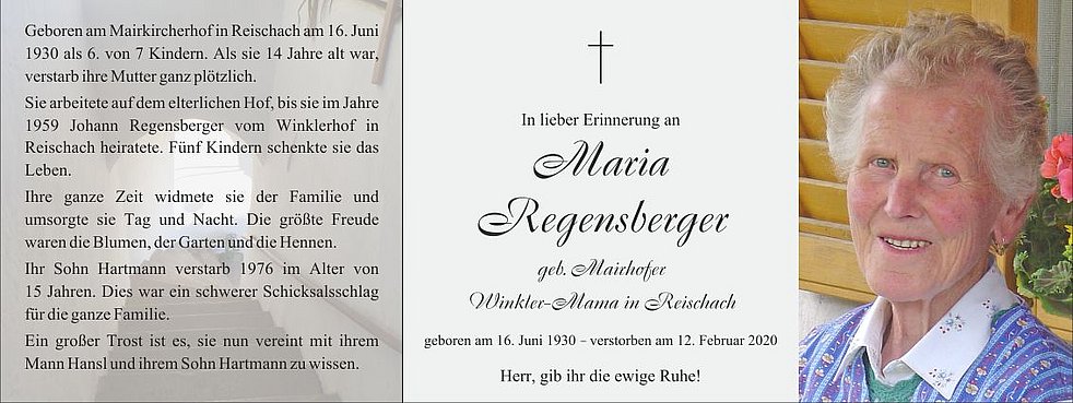 Gemeinsam begleiten wir unsere liebe Mama am Samstag, 15. Februar, um 13.40 Uhr vom Trauerhaus ausgehend, zum Abschiedsgottesdienst um 14 Uhr in die Pfarrkirche von Reischach. Anschließend übergeben wir sie der geweihten Erde.