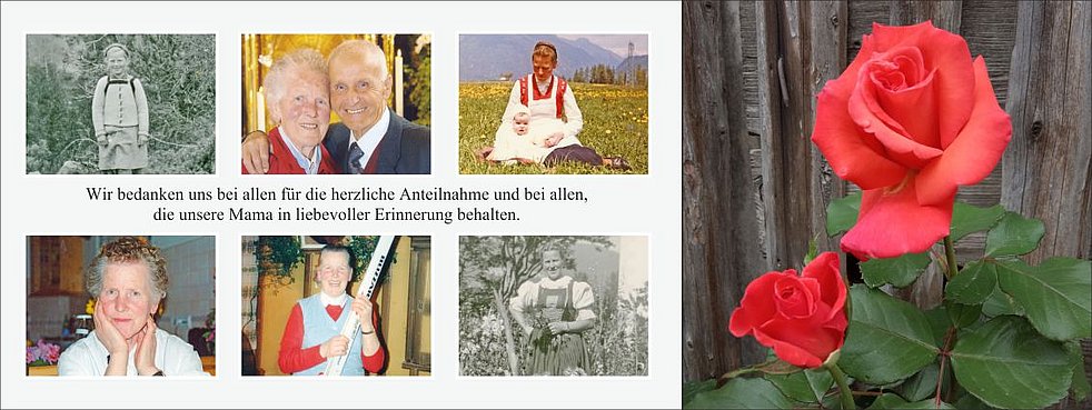 Traurig, aber dankbar für all das Schöne, das wir mit dir teilen durften, nehmen wir Abschied von unserer lieben Mama, Oma und Schwiegermama, Frau