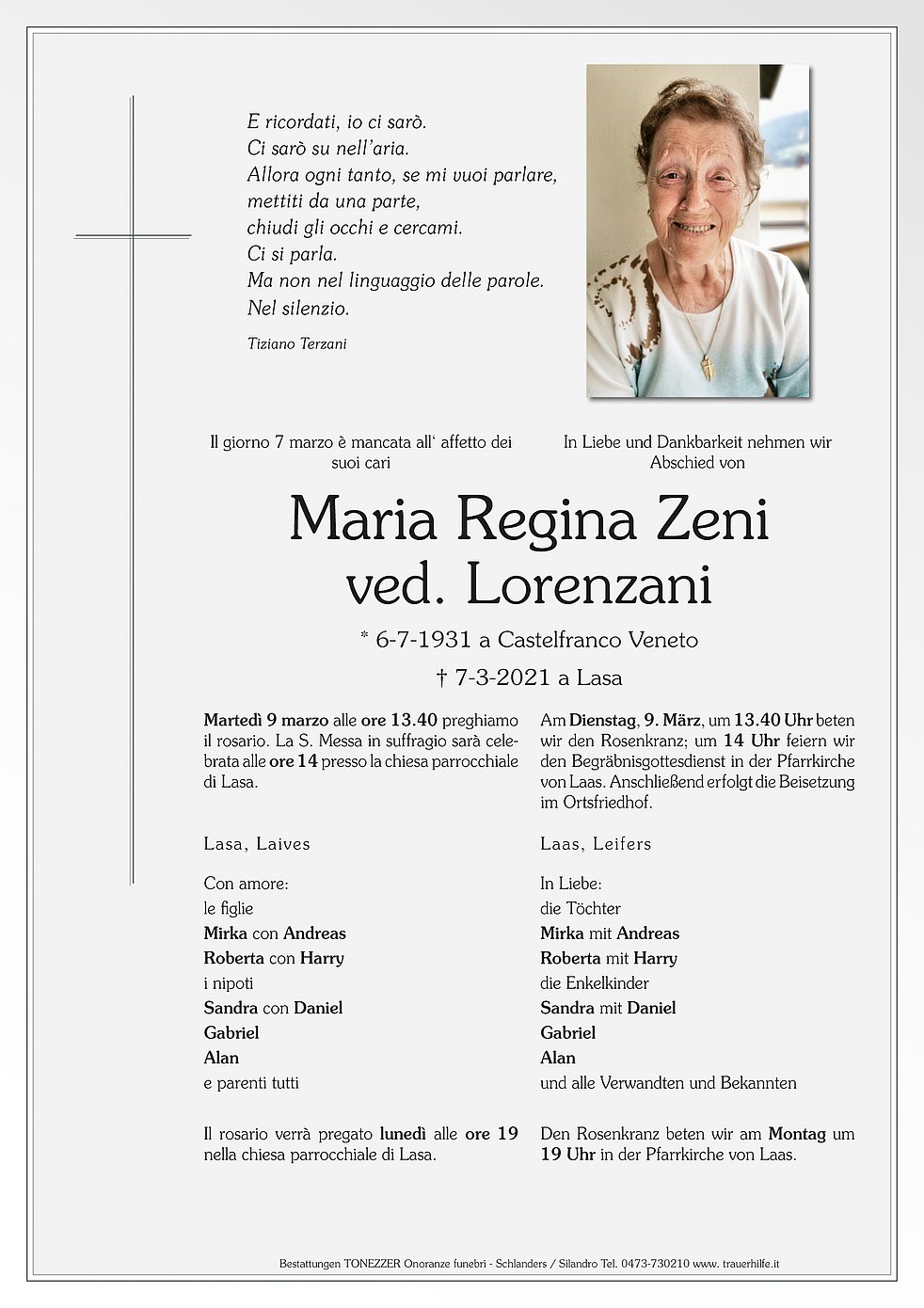 Am Dienstag, 9. März, um 13.40 Uhr beten wir den Rosenkranz; um 14 Uhr feiern wir den Begräbnisgottesdienst in der Pfarrkirche von Laas. Anschließend erfolgt die Beisetzung im Ortsfriedhof.