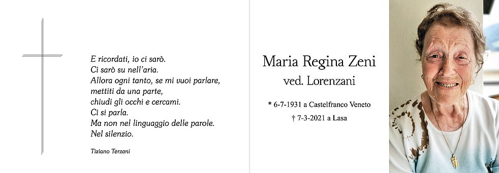 Martedì 9 marzo alle ore 13.40 preghiamo il rosario. La S. Messa in suffragio sarà celebrata alle ore 14 presso la chiesa parrocchiale di Lasa.