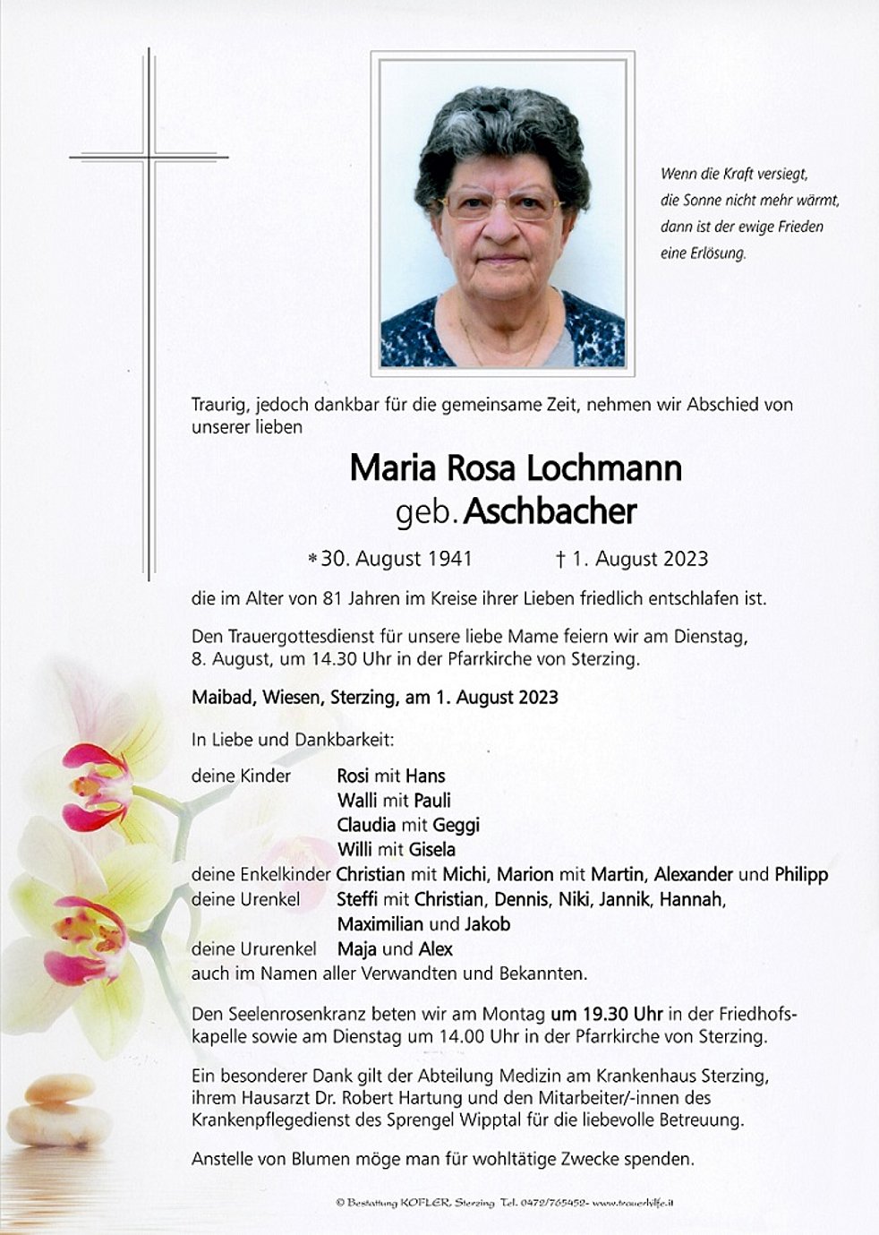 Den Trauergottesdienst für unsere liebe Mame feiern wir am Dienstag, 8. August, um 14.30 Uhr in der Pfarrkirche von Sterzing.