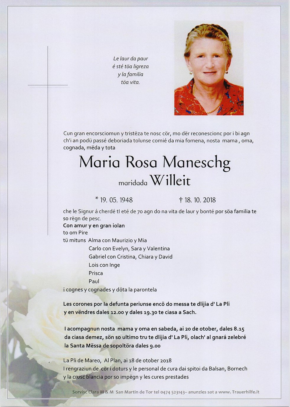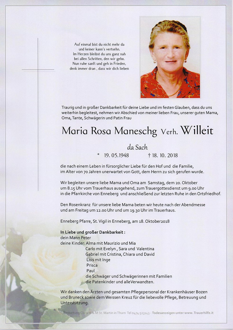 Wir begleiten unsere liebe Mama und Oma am Samstag, dem 20. Oktober um 8.15 Uhr vom Trauerhaus ausgehend, zum Trauergottesdienst um 9.00 Uhr in die Pfarrkirche von Enneberg und anschließend zur letzten Ruhe in den Ortsfriedhof.