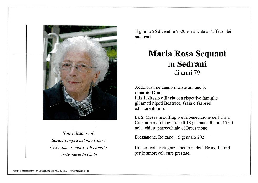 La S. Messa in suffragio e la benedizione dell’Urna Cineraria avrà luogo lunedì 18 gennaio alle ore 15.00 nella chiesa parrocchiale di Bressanone.