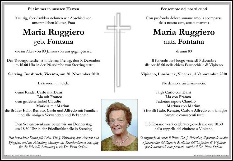 Si ringrazia di cuore il Prim. Dr. J. Frötscher, il personale medico e paramedico del Reparto Medicina dell´Ospedale di Vipiteno per le amorevoli cure prestate,