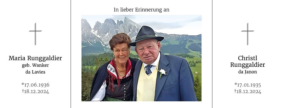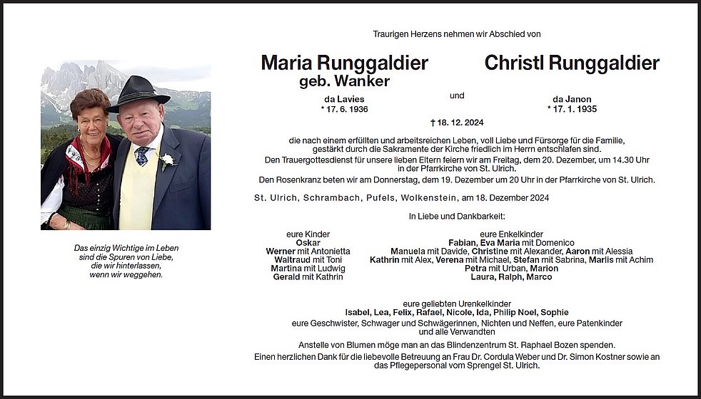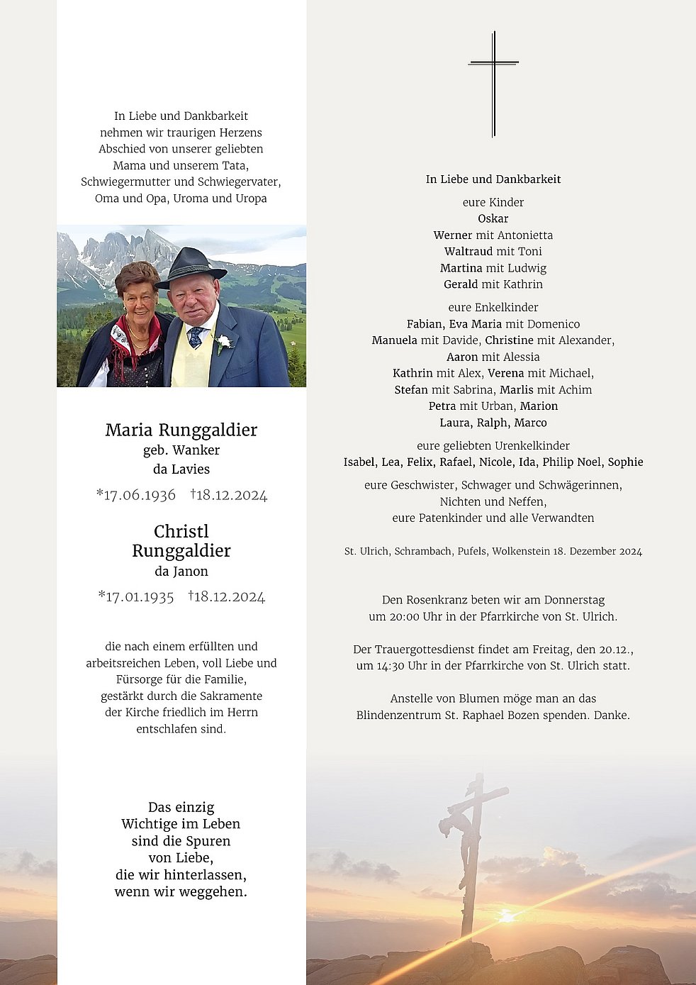 Den Trauergottesdienst für unsere lieben Eltern feiern wir am Freitag, dem 20. Dezember, um 14.30 Uhr in der Pfarrkirche von St. Ulrich.