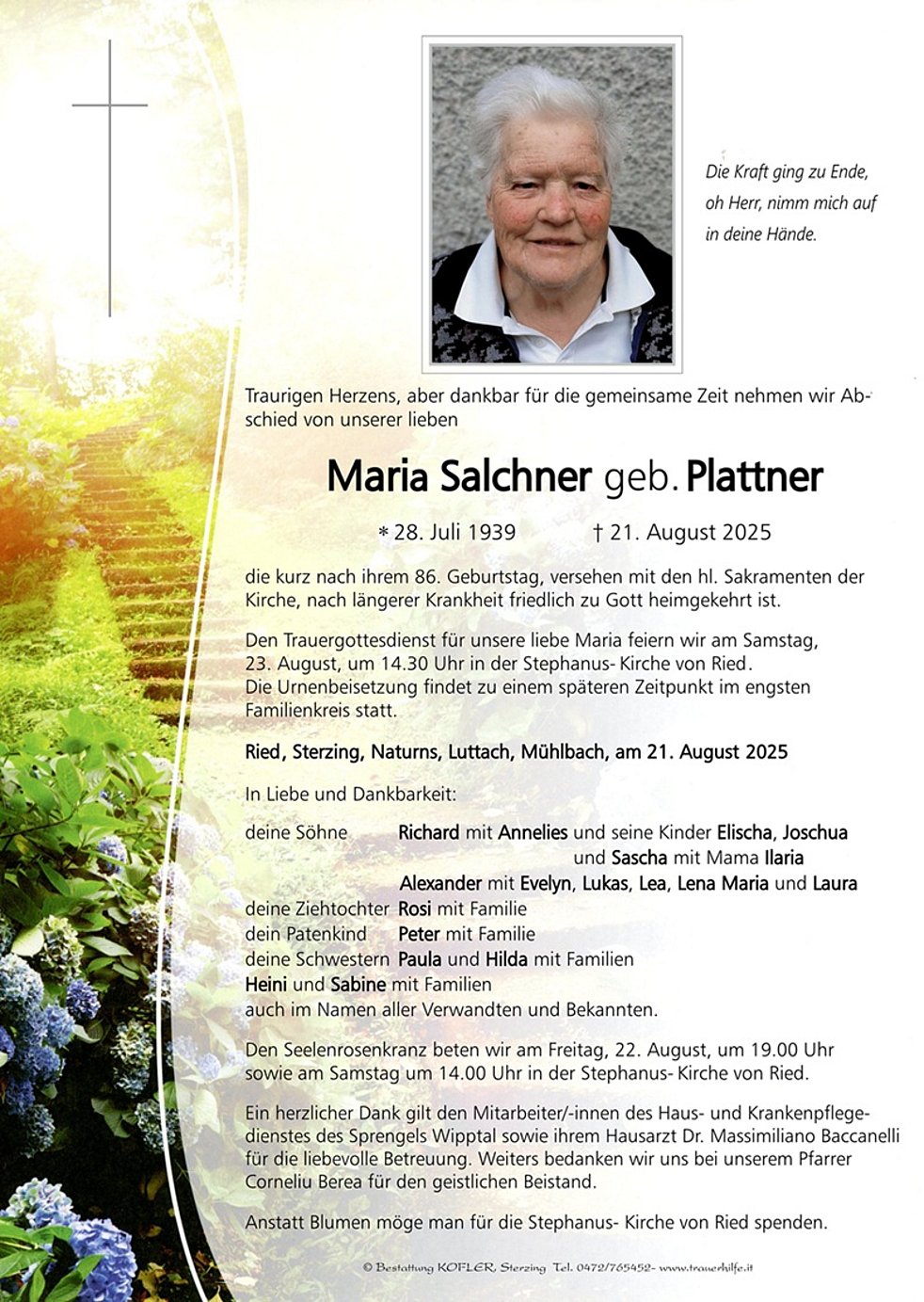 Den Trauergottesdienst feiern wir am Samstag, 23. August, um 14.30 Uhr in der Stephanus- Kirche von Ried. Die Urnenbeisetzung findet zu einem späteren Zeitpunkt im engsten Familienkreis statt.
