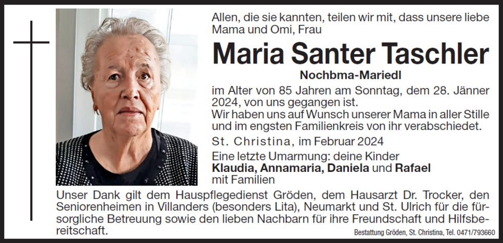 Unser Dank gilt dem Hauspflegedienst Gröden, dem Hausarzt Dr. Trocker, den Seniorenheimen in Villanders (besonders Lita), Neumarkt und St. Ulrich für die fürsorgliche Betreuung sowie den lieben Nachbarn für ihre Freundschaft und Hilfsbereitschaft.