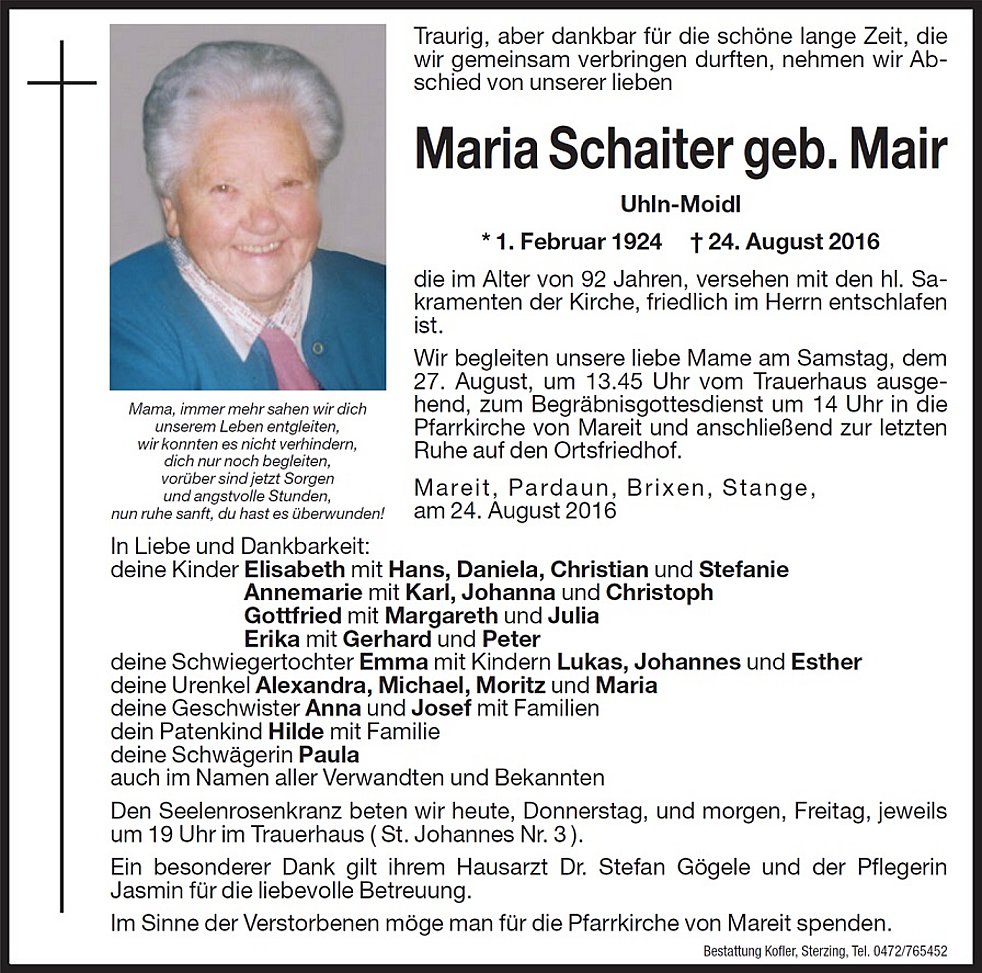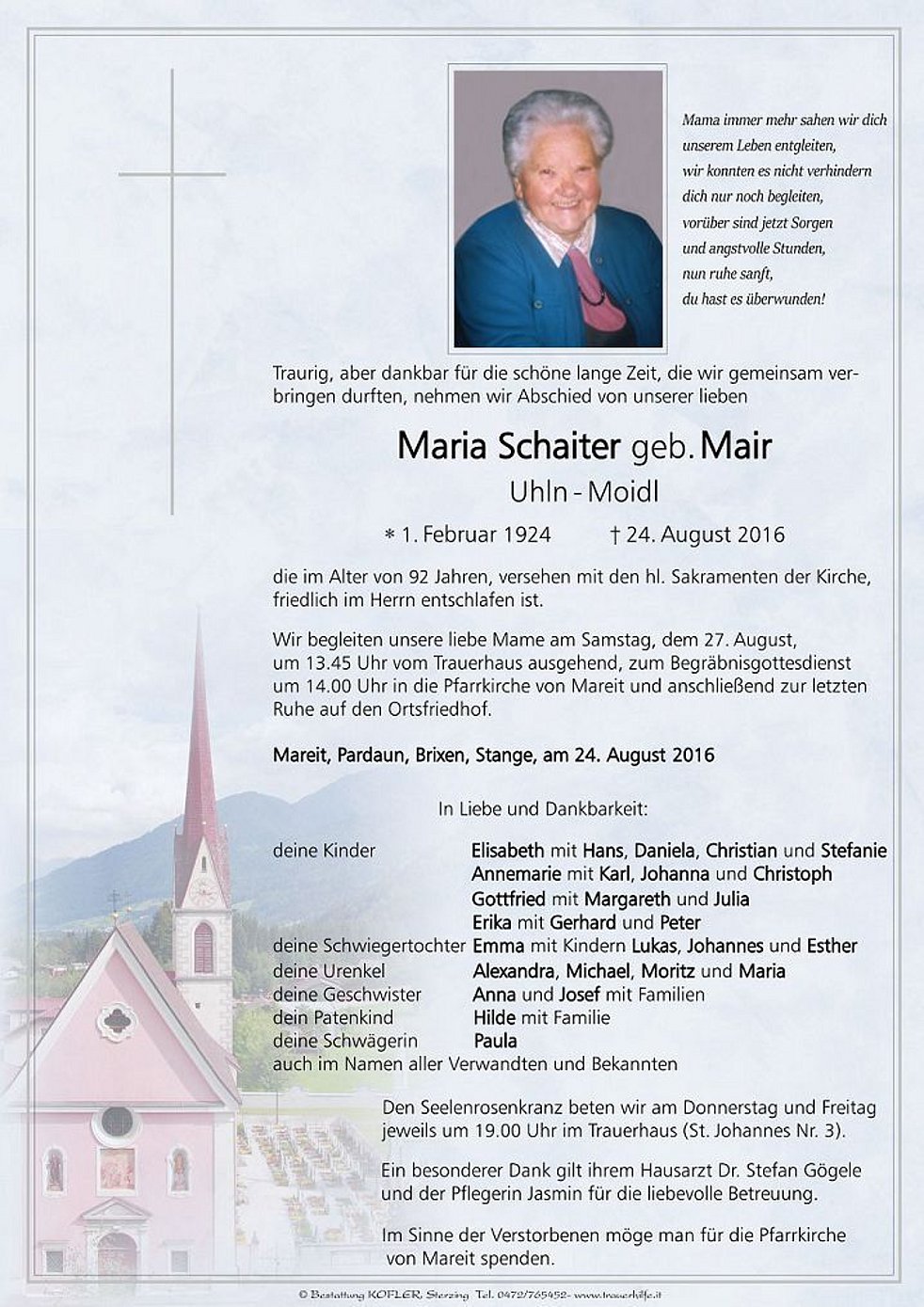 Wir begleiten unsere liebe Mame am Samstag, dem 27. August, um 13.45 Uhr vom Trauerhaus ausgehend, zum Begräbnisgottesdienst um 14.00 Uhr in die Pfarrkirche von Mareit und anschließend zur letzten Ruhe auf den Ortsfriedhof.
