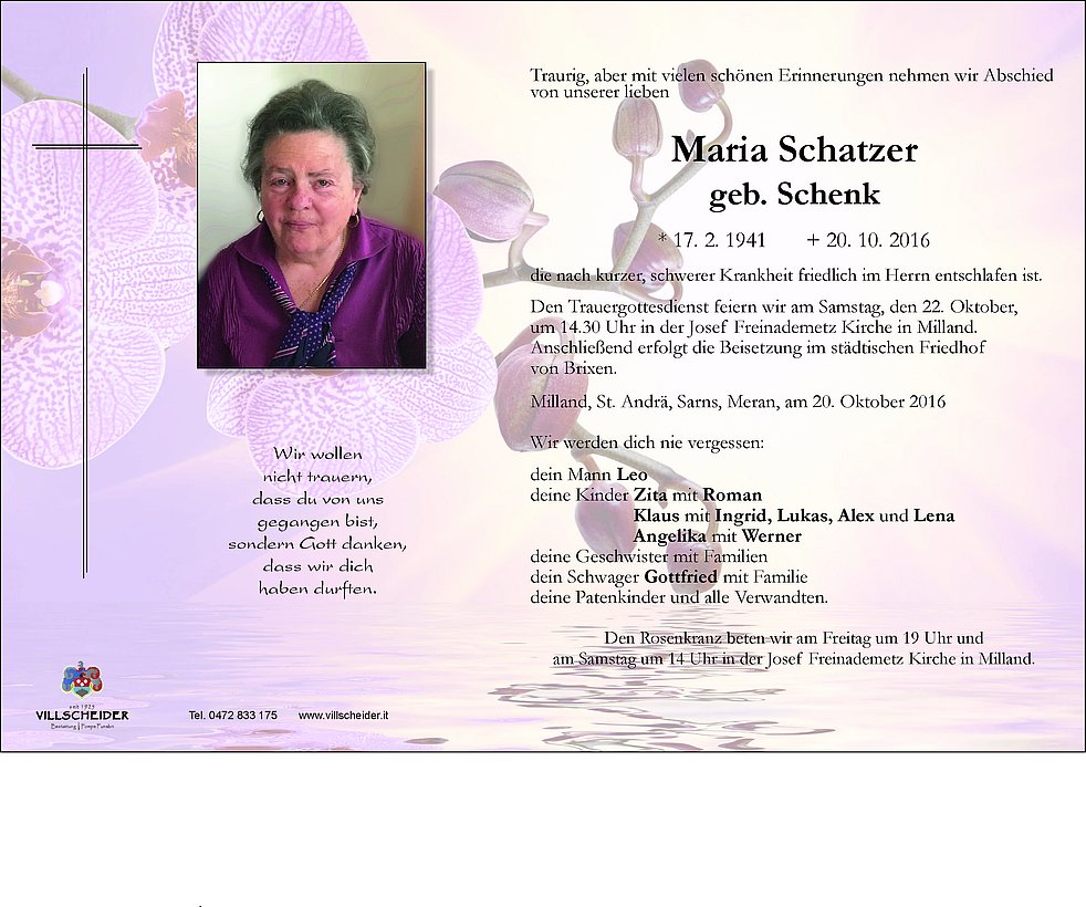 um 14.30 Uhr in der Josef Freinademetz Kirche in Milland. Anschließend erfolgt die Beisetzung im städtischen Friedhof