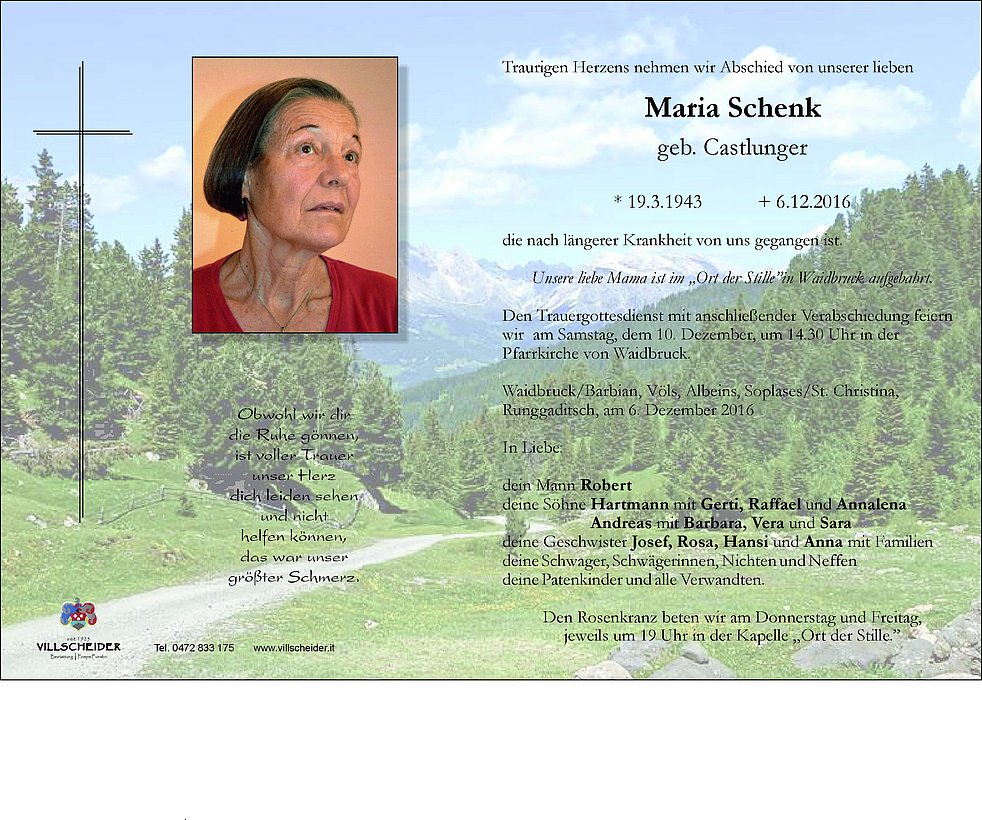Den Trauergottesdienst mit anschließender Verabschiedung feiern wir am Samstag, dem 10. Dezember, um 14.30 Uhr in der Pfarrkirche von Waidbruck.