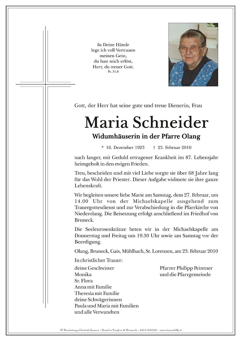 Wir begleiten unsere liebe Marie am Samstag, dem 27. Februar, um 14.00 Uhr von der Michaelskapelle ausgehend zum Trauergottesdienst und zur Verabschiedung in die Pfarrkirche von Niederolang. Die Beisetzung erfolgt anschließend im Friedhof von Bruneck.