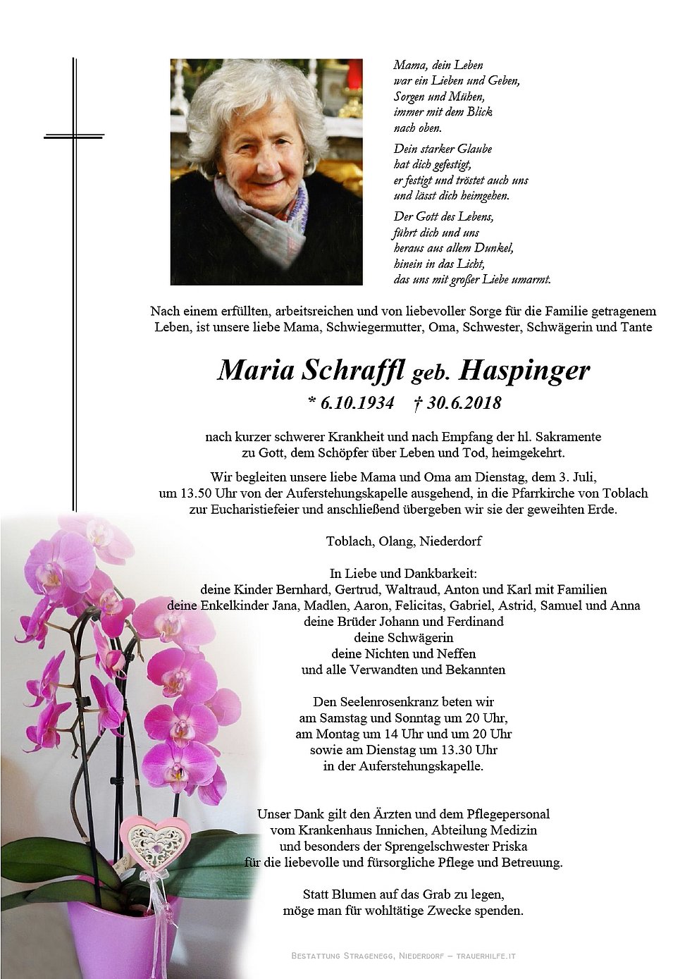 Wir begleiten unsere liebe Mama und Oma am Dienstag, dem 3. Juli, um 13.50 Uhr von der Auferstehungskapelle ausgehend, in die Pfarrkirche von Toblach zur Eucharistiefeier und anschließend übergeben wir sie der geweihten Erde.