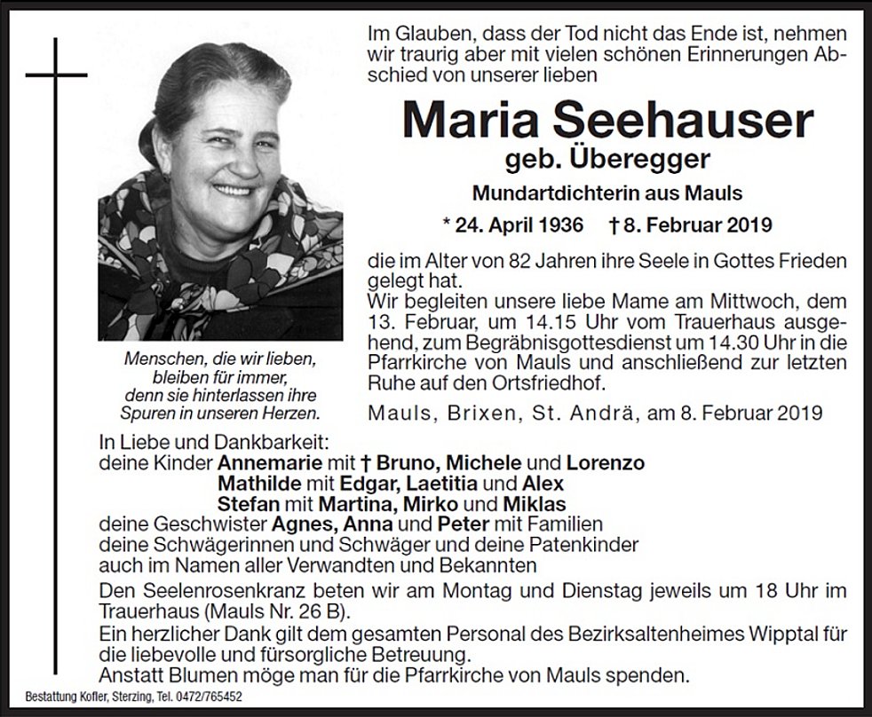Wir begleiten unsere liebe Mame am Mittwoch, dem 13. Februar, um 14.15 Uhr vom Trauerhaus ausgehend, zum Begräbnisgottesdienst um 14.30 Uhr in die Pfarrkirche von Mauls und anschließend zur letzten Ruhe auf den Ortsfriedhof.
