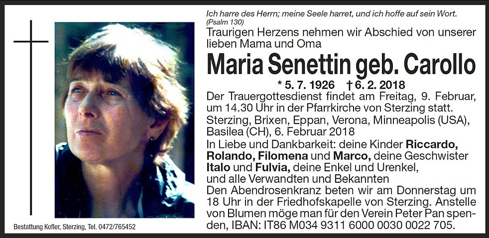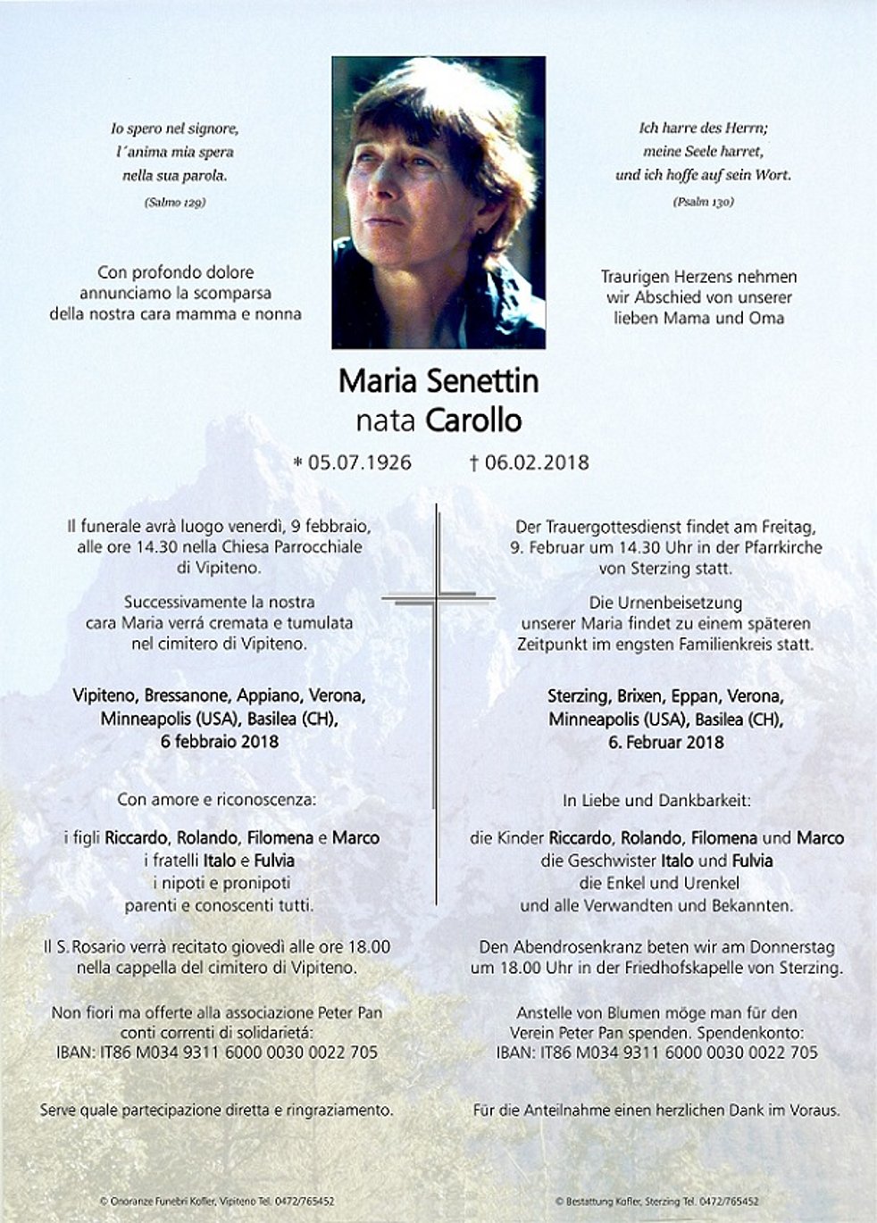 Anstelle von Blumen möge man für den Verein Peter Pan spenden. Spendenkonto: IBAN: IT86 M034 9311 6000 0030 0022 705