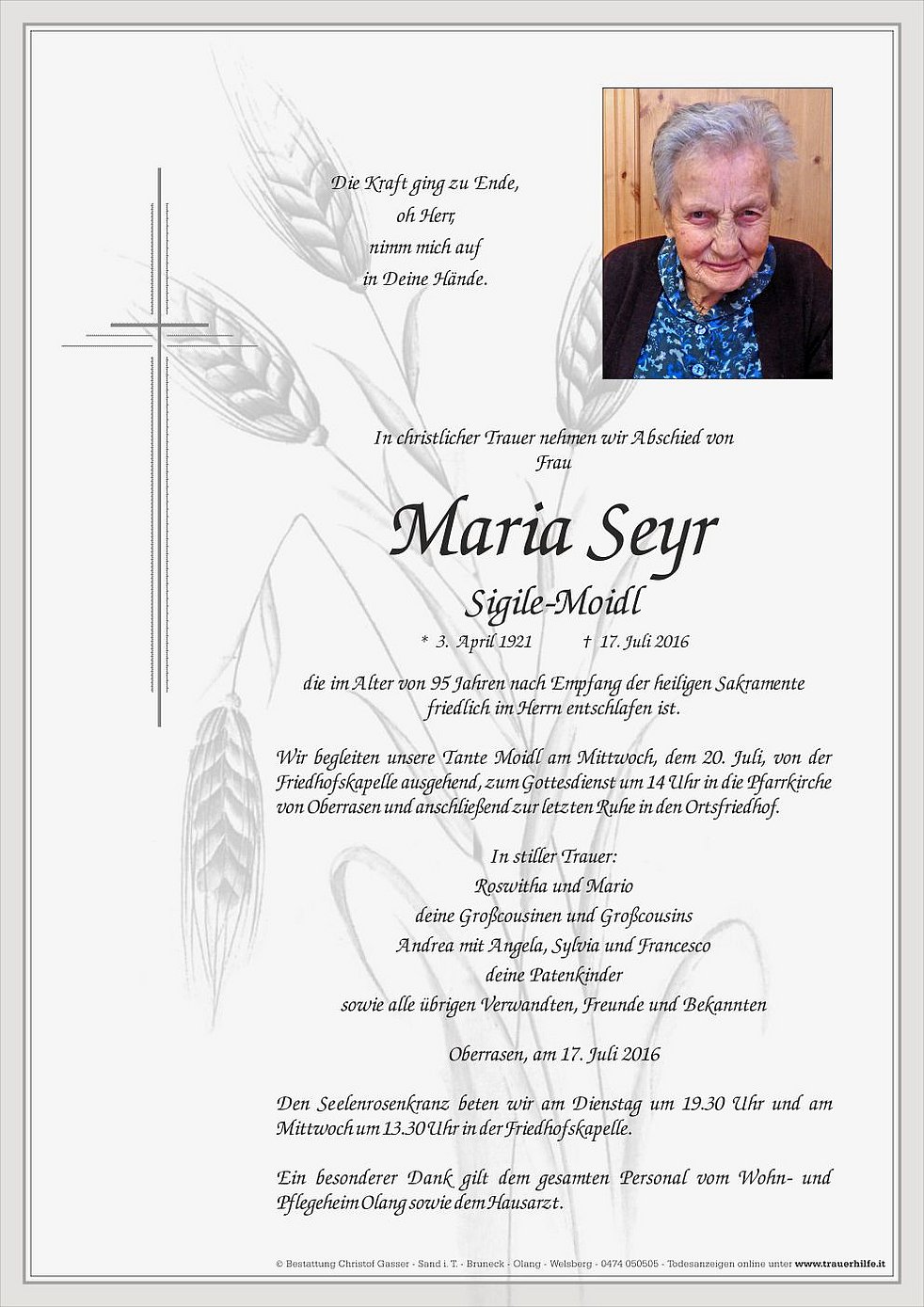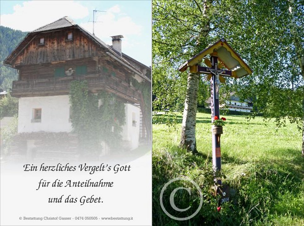 Wir begleiten unsere Tante Moidl am Mittwoch, dem 20. Juli, von der Friedhofskapelle ausgehend, zum Gottesdienst um 14 Uhr in die Pfarrkirche von Oberrasen und anschließend zur letzten Ruhe in den Ortsfriedhof.