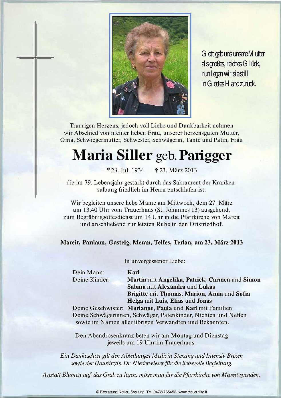 Anstatt Blumen auf das Grab zu legen, möge man für die Pfarrkirche von Mareit spenden.