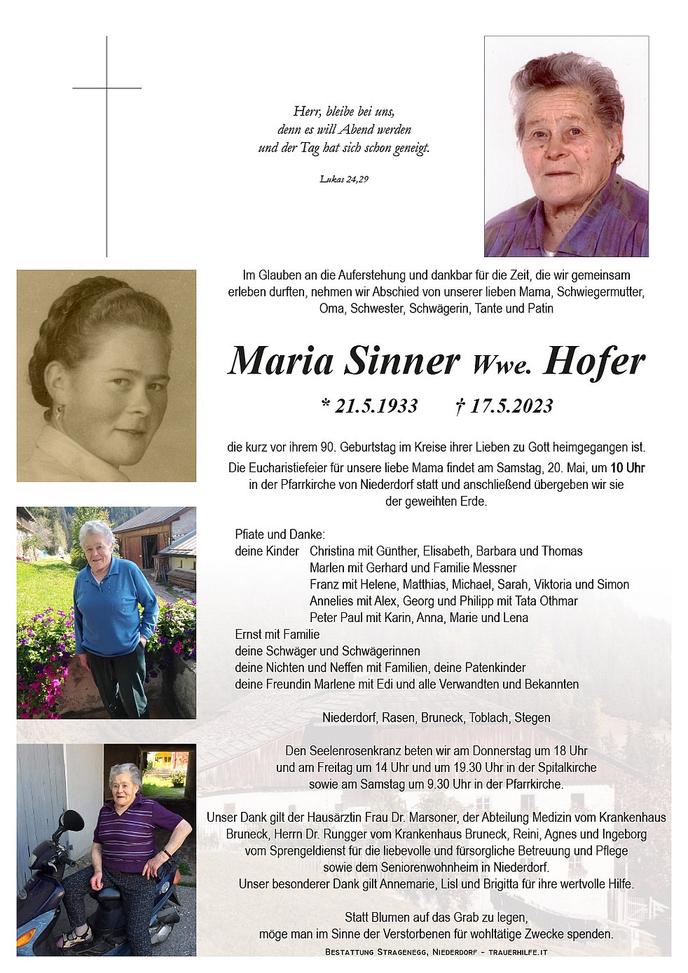 Maria,du hast dir den Himmel ehrlich verdient,wars immer eine liebevolle Frau. Aufrichtige Anteilnahme . Wenn dein schweres Herz dich nur noch mühsam gehen lässt, ergreife die Hände derer, die dich lieben - sie geben dir Halt und Zuversicht. Familie Messner Erich Prags.