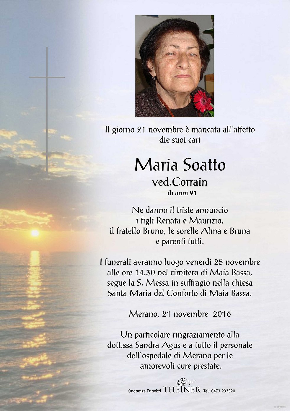 Un particolare ringraziamento alla dott.ssa Sandra Agus e a tutto il personale dell`ospedale di Merano per le amorevoli cure prestate.