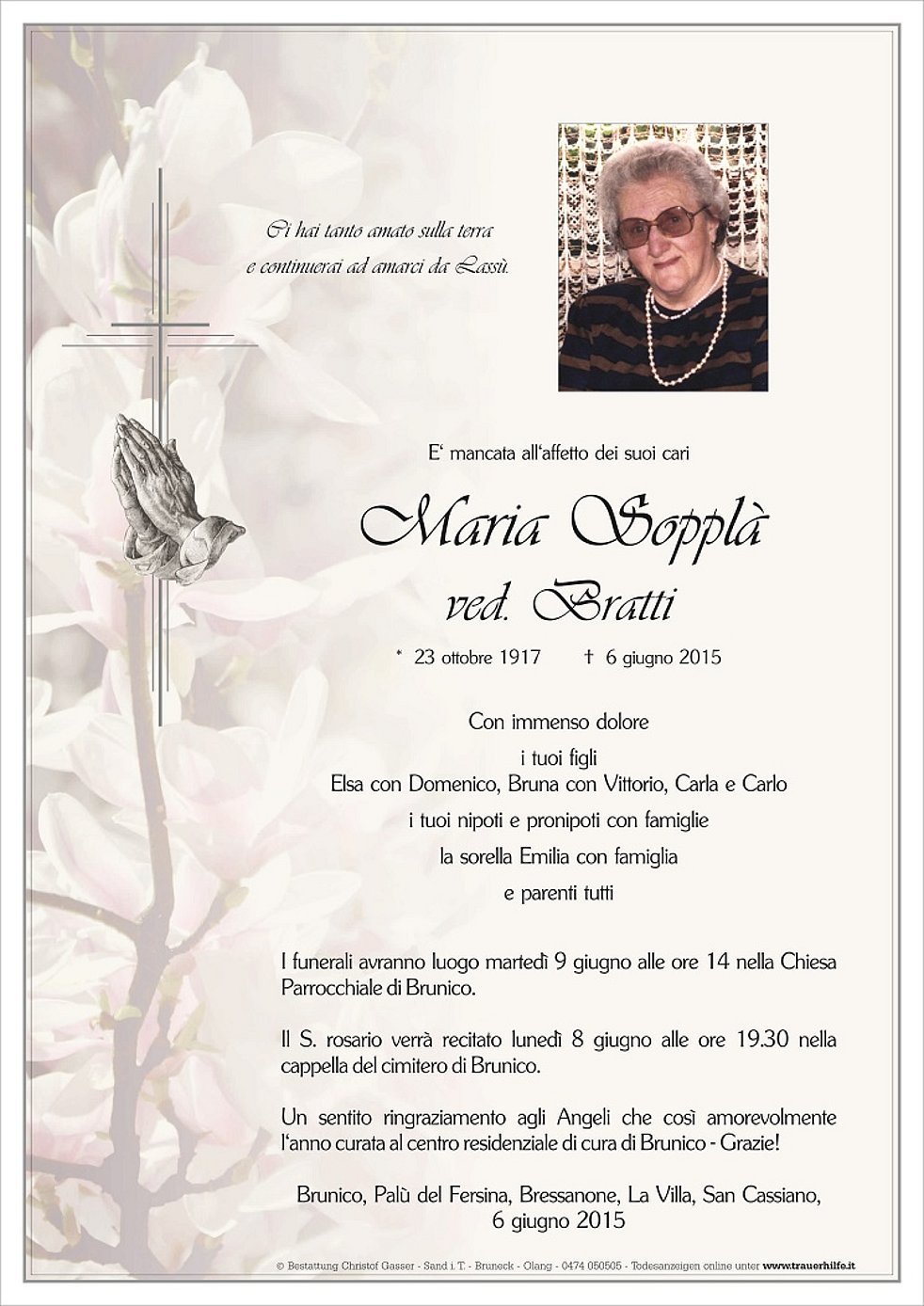 I funerali avranno luogo martedì 9 giugno alle ore 14 nella Chiesa Parrocchiale di Brunico.
