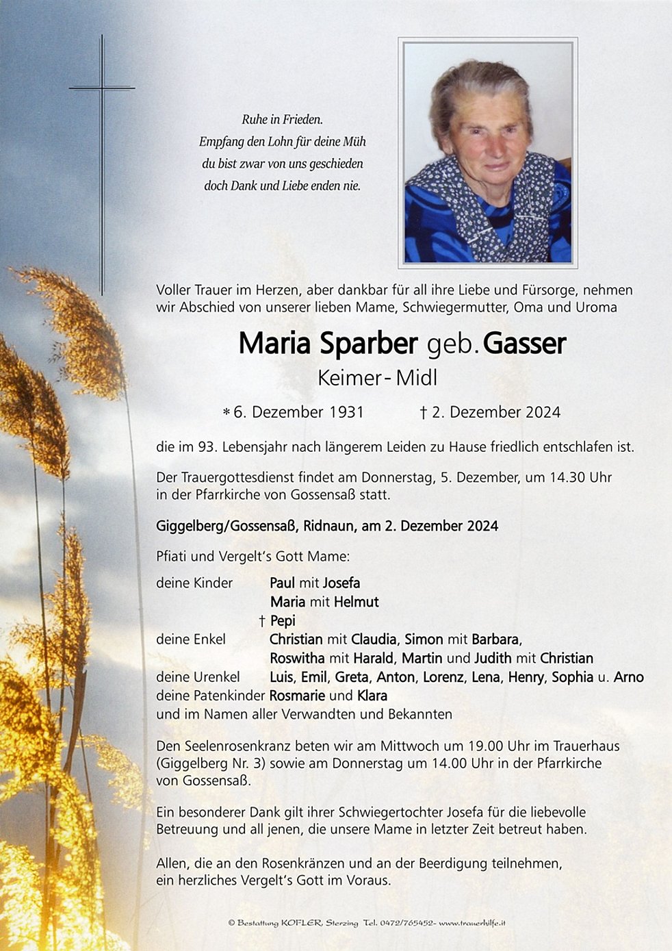 Der Trauergottesdienst findet am Donnerstag, 5. Dezember, um 14.30 Uhr in der Pfarrkirche von Gossensaß statt.